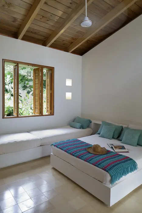 Pensando en la conveniencia de los niños, la casa se desarrolló en un piso y su distribución se dilató lo más posible usando los corredores como espacios de transición entre las alcobas, la piscina y la zona social, extendiendo un alero que sombrea las franjas de circulación y refresca las habitaciones, en las cuales se usaron cubiertas inclinadas que dejan a la vista el entramado de madera para “establecer una diferencia con el típico espacio urbano de cielo raso plano y blanco, permitiendo que incluso los niños pudieran identificar el carácter diferente de este espacio para el descanso”, explica Ortiz.