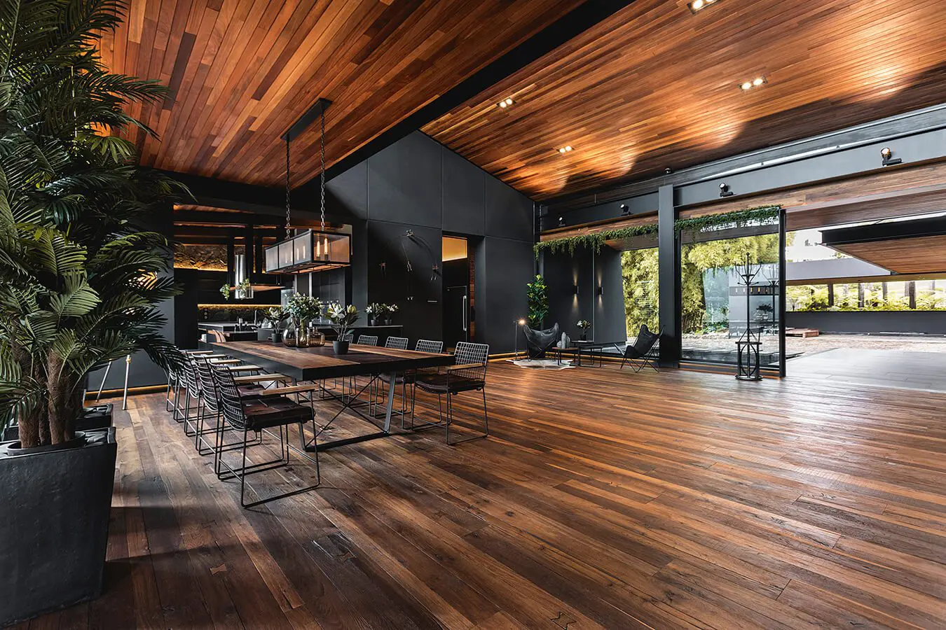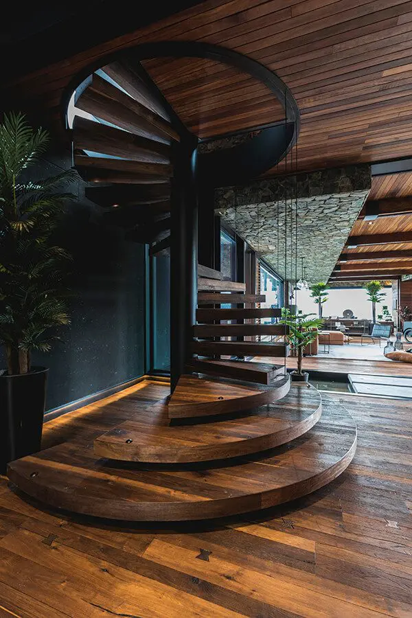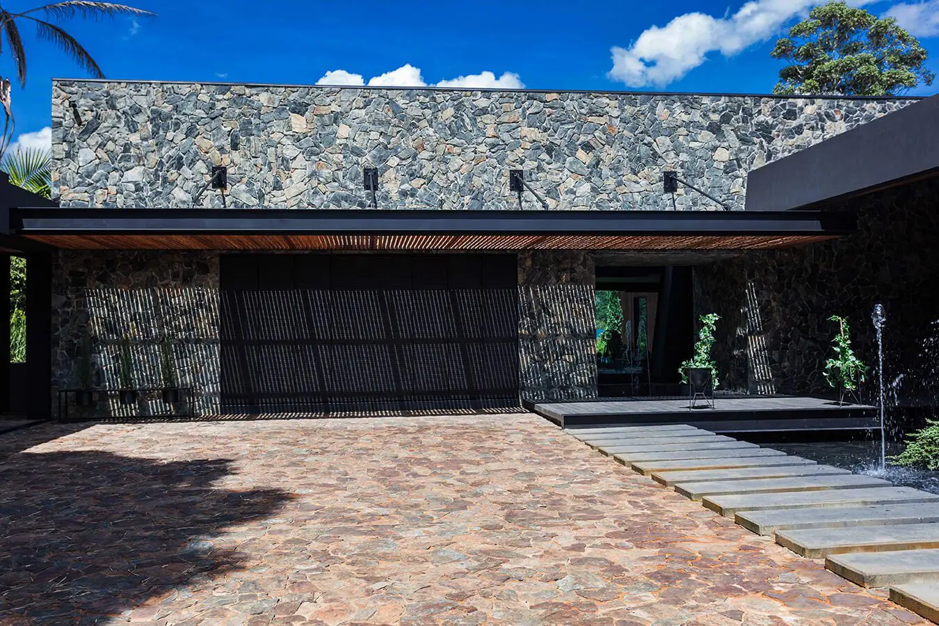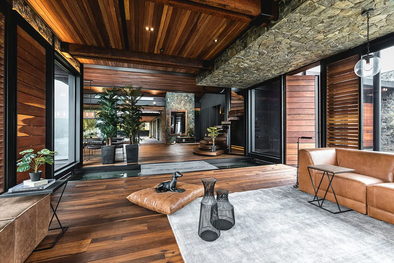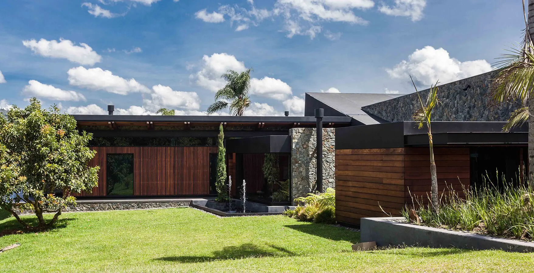 “Hace treinta o cuarenta años, en Medellín había un acercamiento a la piedra que se perdió, especialmente en favor del ladrillo”, comenta el arquitecto con respecto a la materialidad del proyecto. Su diseño recupera el uso de este material noble y duradero, cuyas variaciones en texturas y colores permiten mimetizar la construcción en su entorno natural e insertarla de manera respetuosa. Complementada con un extensivo uso de la madera –de roble en pisos, proporcionados por la empresa Pisos Camarú, y de abarco en las vigas que conforman la estructura–, la piedra ofrece un aspecto cálido y acogedor. Piedra y madera se mezclan con un tercero, el metal pintado de negro, que le da al diseño un aire menos rústico y más contemporáneo. “La vivienda tiene un toque de campo y otro de ciudad. Es una casa agradable de vivir”.
