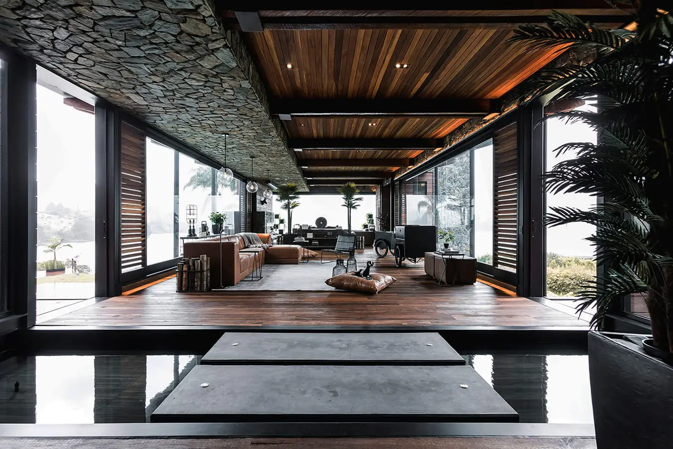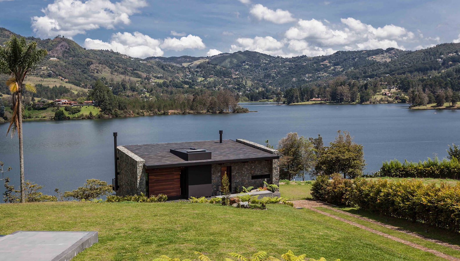 La distribución de la vivienda se hizo en forma de “T”. Los espacios de carácter privado, ubicados en un volumen longitudinal en la parte alta del lote, prácticamente paralelos a la represa, permiten que cada habitación disfrute de la espectacular vista lejana. Los ambientes sociales están en otro cuerpo alargado, esta vez de manera perpendicular a la represa, con lo cual evitan interrumpir las visuales de las alcobas, mientras se ven rodeados por montañas, agua y naturaleza. La parte social, que se despliega en dos niveles, alberga salón, comedor y cocina en el superior, y genera un área de recreo en el inferior, en conexión directa con la piscina.