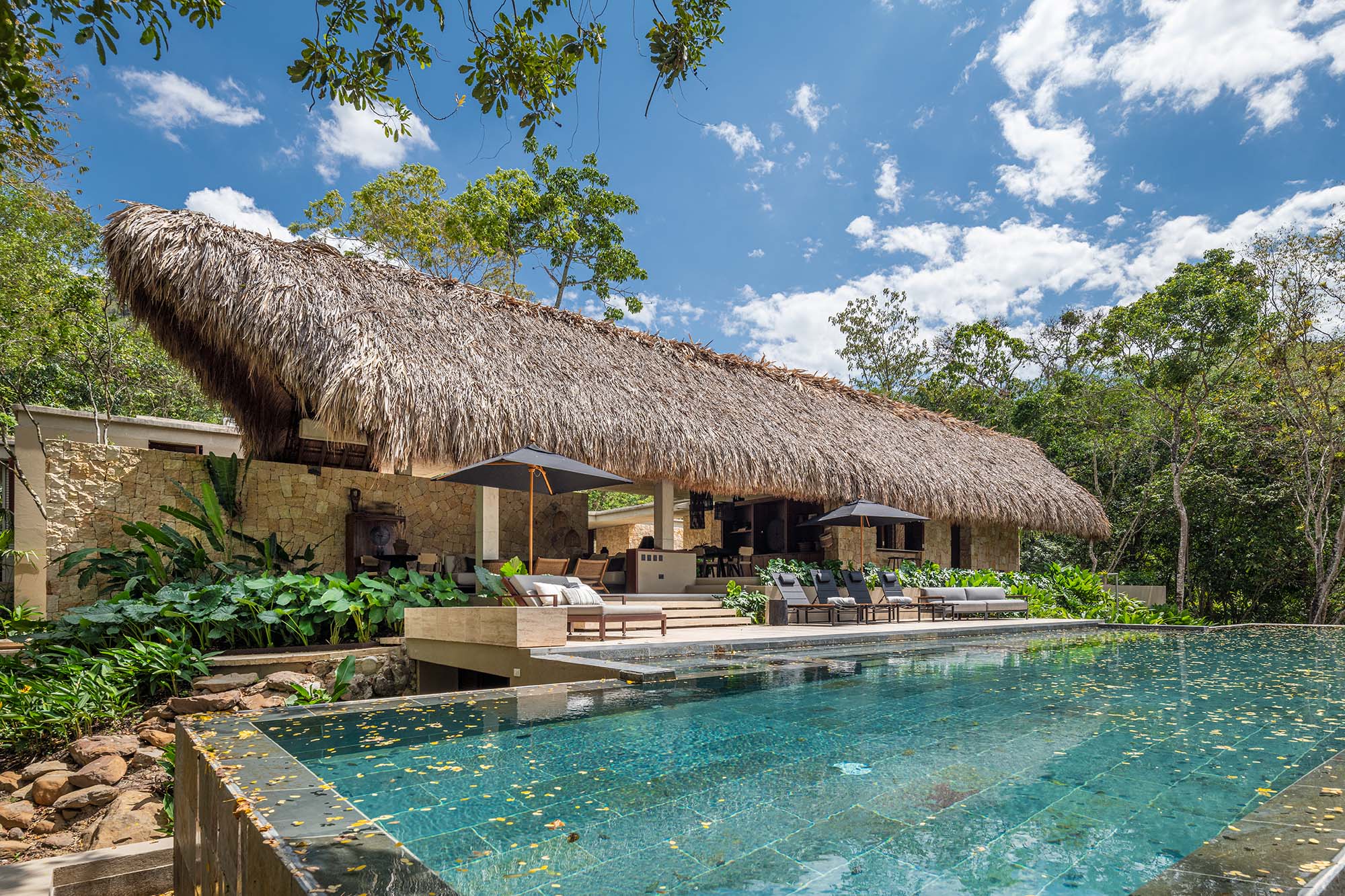 Aquí los muros enchapados en piedra labor se levantaron de tal manera que no tocan la cubierta, lo que produce una sensación de amplitud espacial y de integración con los jardines próximos y los árboles nativos. El salón, el comedor y la cocina se conectan con una piscina a cielo abierto, donde la luz del sol se cuela entre el follaje.