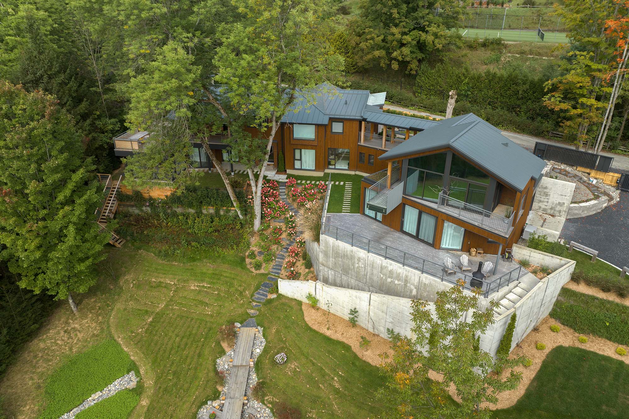El nivel inferior de la ampliación está ocupado por un garaje y una segunda suite principal que ofrece magníficas vistas del sitio. Está contiguo a una gran terraza de madera con chimenea al aire libre.