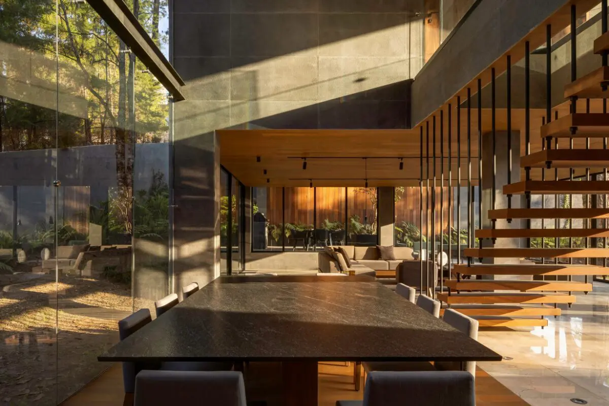 Con volúmenes conectados por puentes acristalados y grandes aperturas hacia el paisaje, el proyecto convierte cada espacio en una experiencia sensorial ligada al entorno.