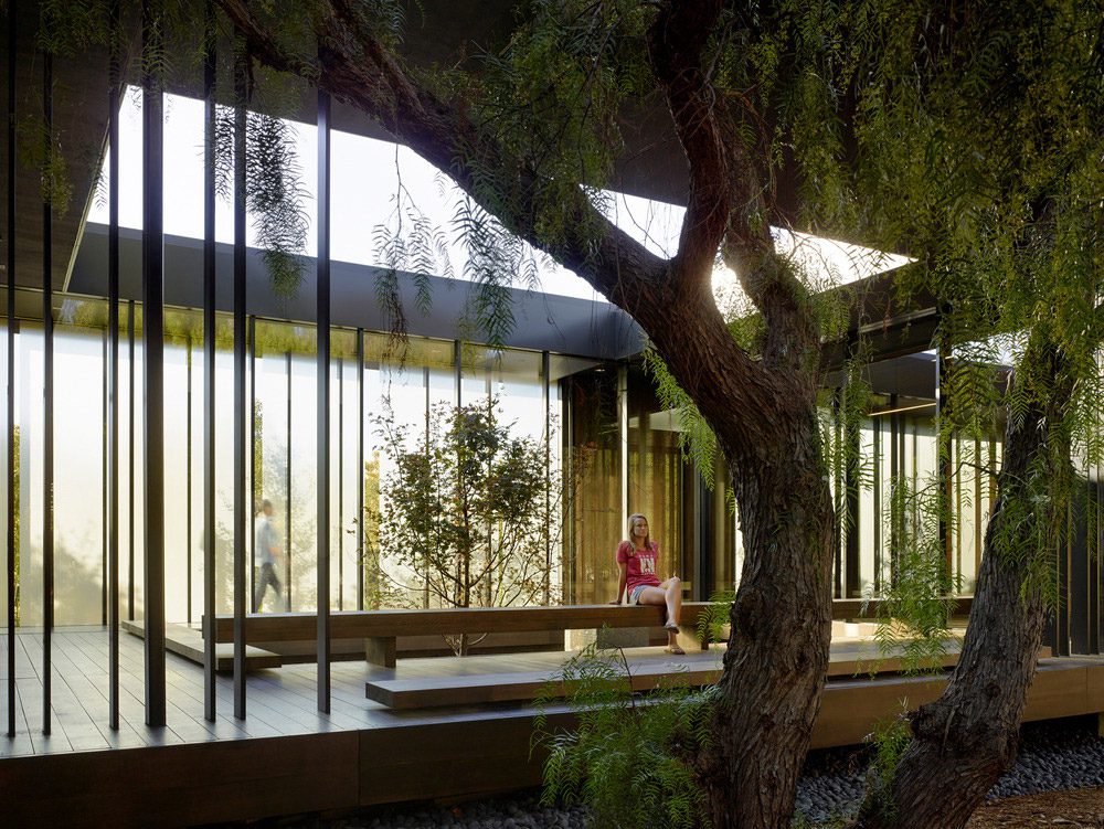 Situado en el corazón del campus, cerca de un bosque de roble natural, la progresión prolongada en la entrada del edificio a través de un largo jardín privado se encuentra cobijada por una línea de bambú.