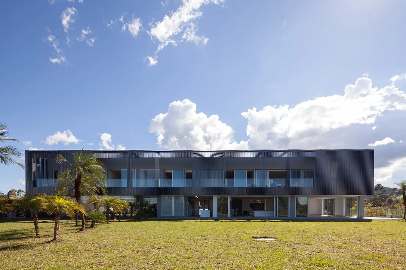 El arquitecto antioqueño Alejandro Barreneche fue el encargado del diseño de esta construcción en una parcelación de Llanogrande. Definida como un prisma, yace casi monolítica sobre una topografía relativamente plana. El encuentro con ella nos enfrenta a una fachada austera en la que una serie de lamas metálicas de color gris oscuro se repiten a un ritmo regular e intermitente, dejando ver solamente la puerta de acceso y el vano del garaje, cuyas dimensiones corresponden a las de un arco de fútbol, profesión y pasión del propietario.