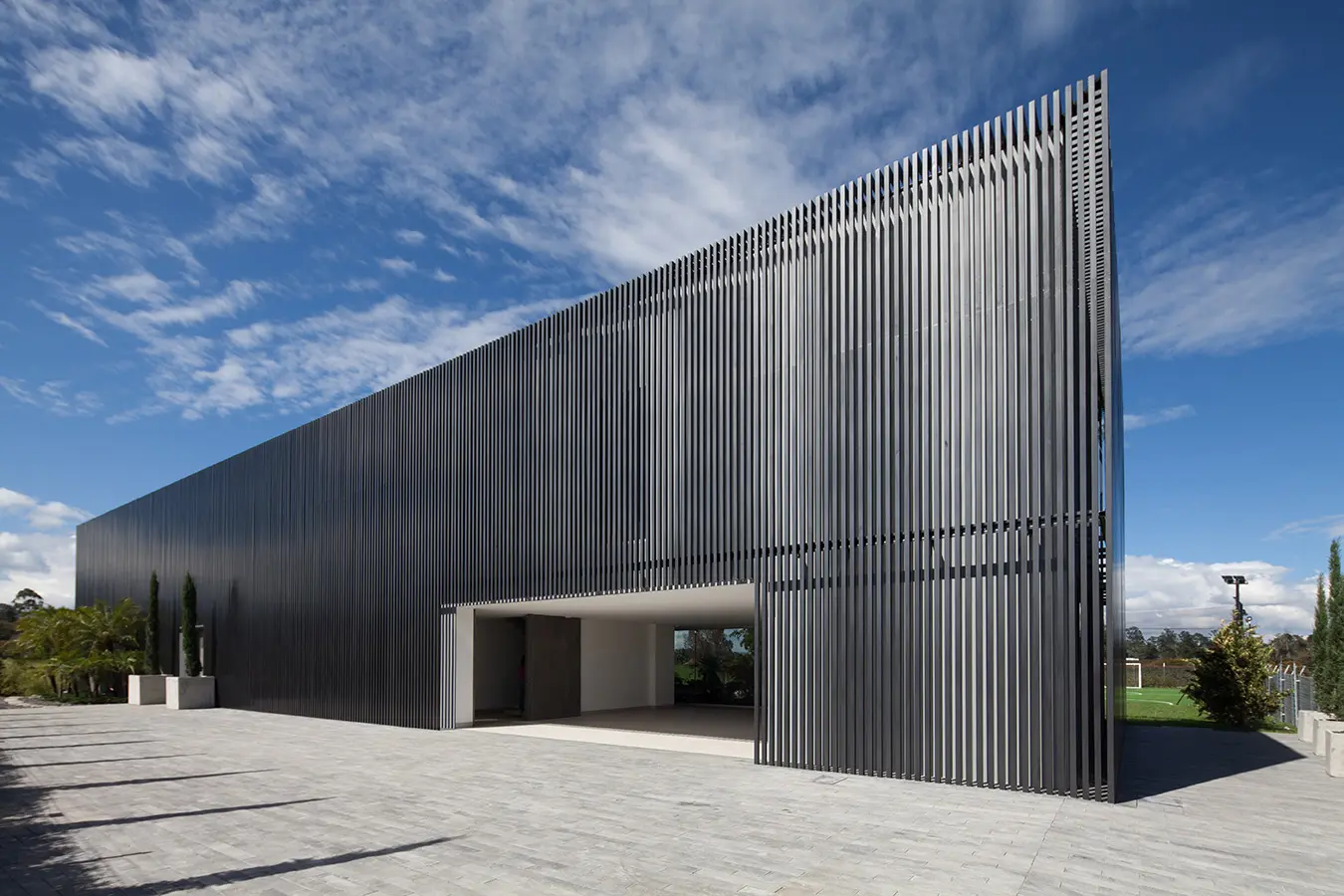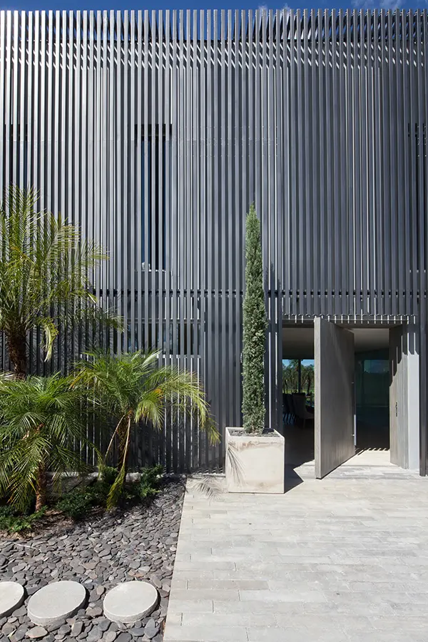Lamas metálicas de color gris oscuro cubren la austera fachada de esta casa, en las afueras de Medellín, para solo dejar ver la puerta de acceso y el vano del garaje, el cual tiene las dimensiones de un arco de fútbol, guiño a la profesión de su propietario.