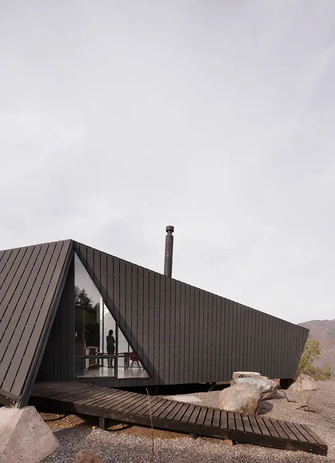 La propuesta para este refugio en San Esteban, Chile,  implicó construir, a través de planos y ángulos, una estructura que proporciona una entrada a través de sus pliegues y vistas exteriores a través de sus cortes. Construido alrededor de un núcleo central de servicios, la forma exterior y el volumen interior están definidos por los pliegues.