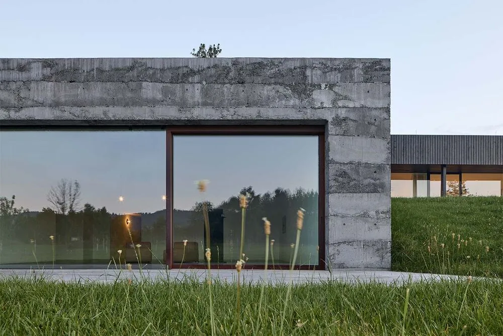 Desde paredes de vidrio corredizas de gran formato hasta ventanas más pequeñas y específicas, en diferentes materiales y detalles. También presenta diseños poco convencionales: ventanas corredizas que flotan en un campo electromagnético, lo que permite que incluso tamaños inusualmente grandes se muevan a un lado; puertas pivotantes; una ventana para sentarse donde el vidrio se retrae para que te encuentres directamente en el jardín; una ventana que levita en medio de un panel de vidrio; ventanas y puertas revestidas de latón o corten. Conexión y fusión: arquitectura del edificio La arquitectura y la atmósfera del edificio fueron moldeadas por pensamientos sobre ventanas de calidad: sobre encarnar la filosofía de conectar el diseño con el paisaje, sobre la apertura a la naturaleza, transiciones suaves entre el interior y el jardín, y vistas sin obstáculos. Al mismo tiempo, existía el deseo de que el edificio en sí no perturbara el paisaje. Por lo tanto, es más áspero y oscuro en el exterior, sobrio y tranquilo en el interior.