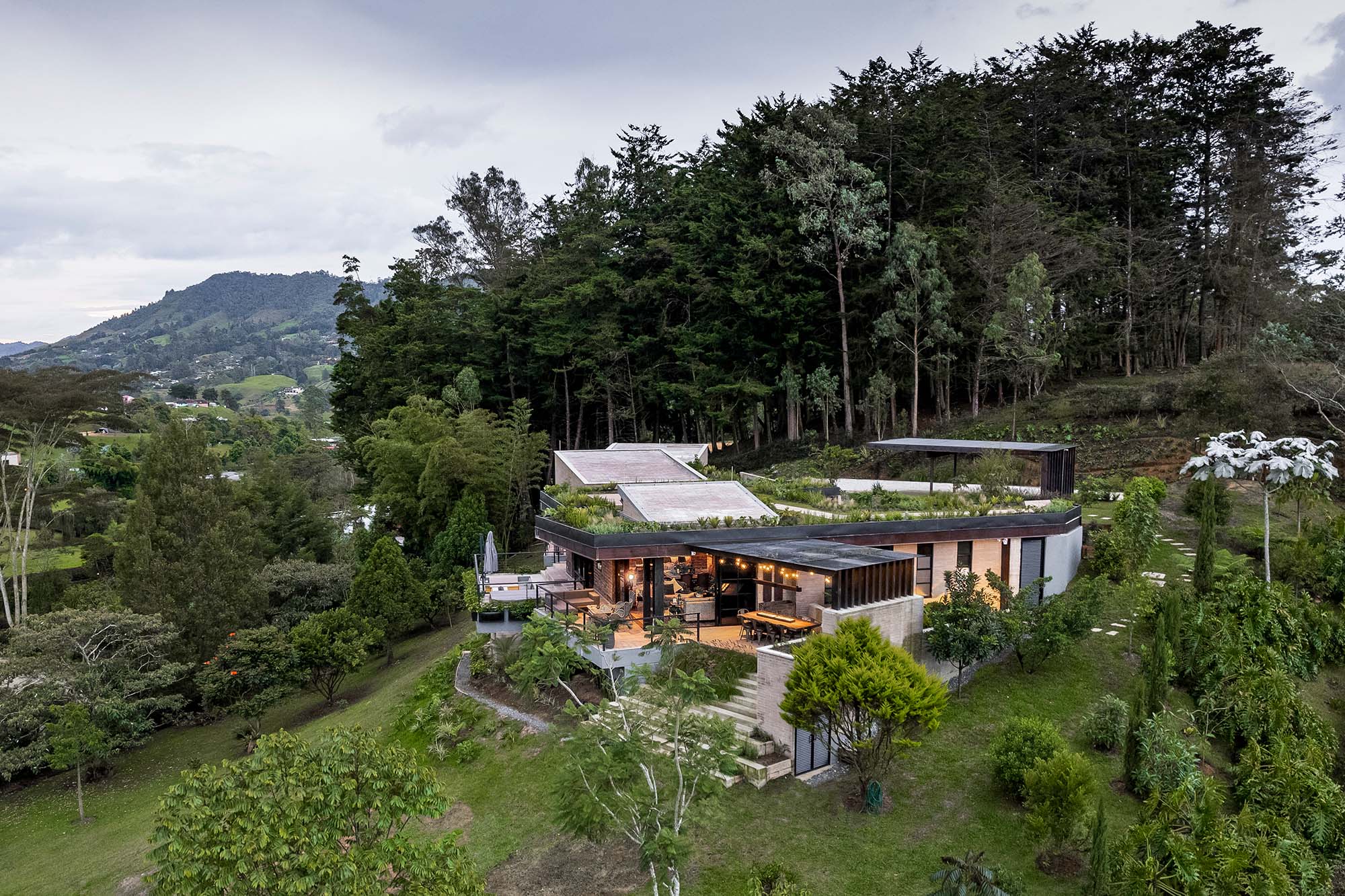 Al incrustarse en la topografía montañosa del lugar, la casa reduce el impacto de su presencia para enfatizar la condición de mirador del lote. Al mismo tiempo, esta decisión sobre su emplazamiento produjo una espacialidad interior que desciende y acompaña la pendiente, configurando una secuencia de espacios cubiertos y abiertos que permite habitar el paisaje, además de observarlo.