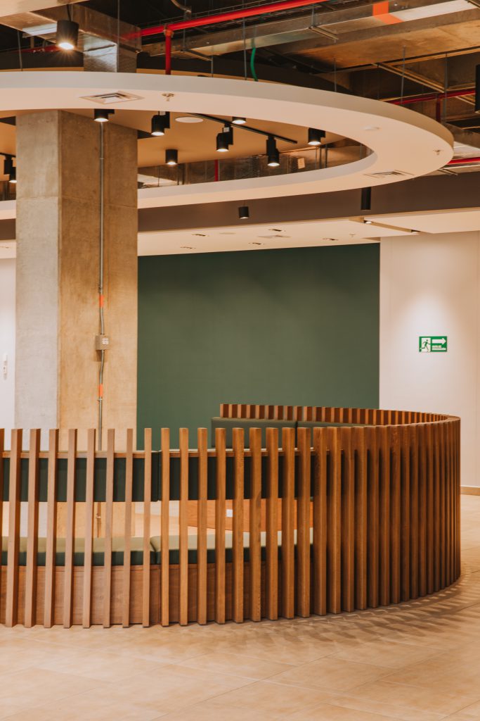 Sobre la cubierta de dicha plataforma ubicaron la mayor parte de los servicios comunes: terrazas arborizadas, auditorio subdividido y áreas de alimentación para los empleados, estipuladas como zonas de ocio, interacción y pausa activa para que los colaboradores que ocupan las oficinas puedan adelantar en este sitio un trabajo informal y relajado, tipo coworking.
