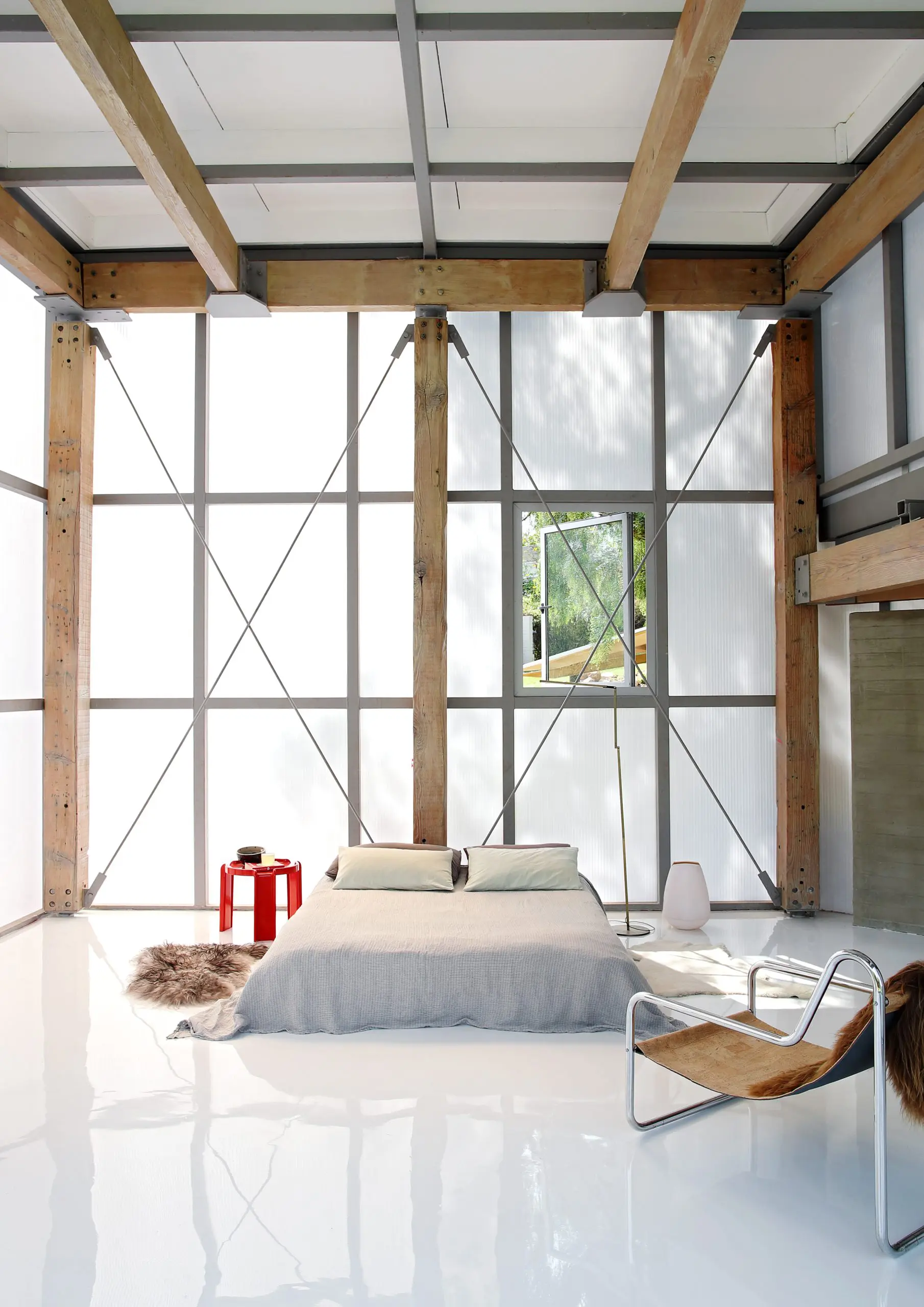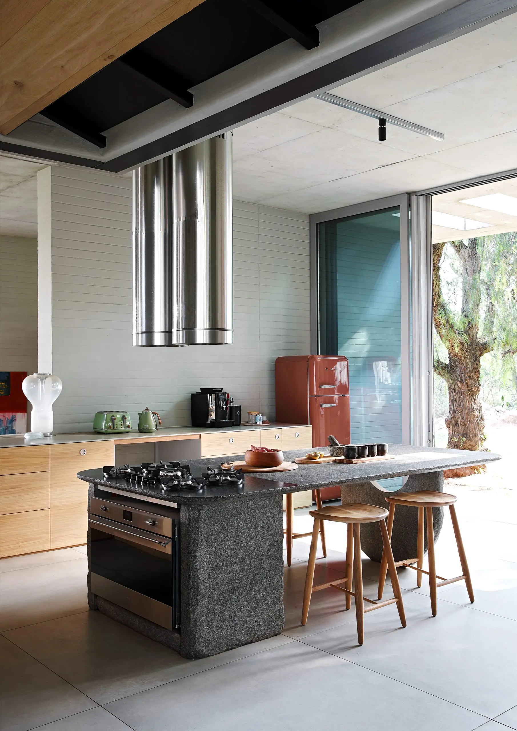 El interiorismo es un buen ejemplo del uso de detalles y de materialidad, desde la isla de la cocina de granito monolítico hasta los elementos de acrílico moldeado del baño. En este último ambiente la estética se expresa en grifos y accesorios de ducha inspirados en la agricultura industrial, de nuevo en juego con la idea de construir una máquina para vivir.El mobiliario es una colección de piezas modernistas adquiridas por Silvio y Lesley, que incluye artículos como la silla Elda, del diseñador industrial italiano Joe Colombo (1930-1971), una ruptura audaz con la tradición que utiliza materiales nuevos para encontrar formas novedosas; el Grand Repos, del diseñador francés Jean Prouvé (1901-1984), una obra maestra mecánica temprana, y las sillas en forma de S en voladizo que definieron la era del arquitecto y diseñador industrial danés Verner Panton (1926-1998).