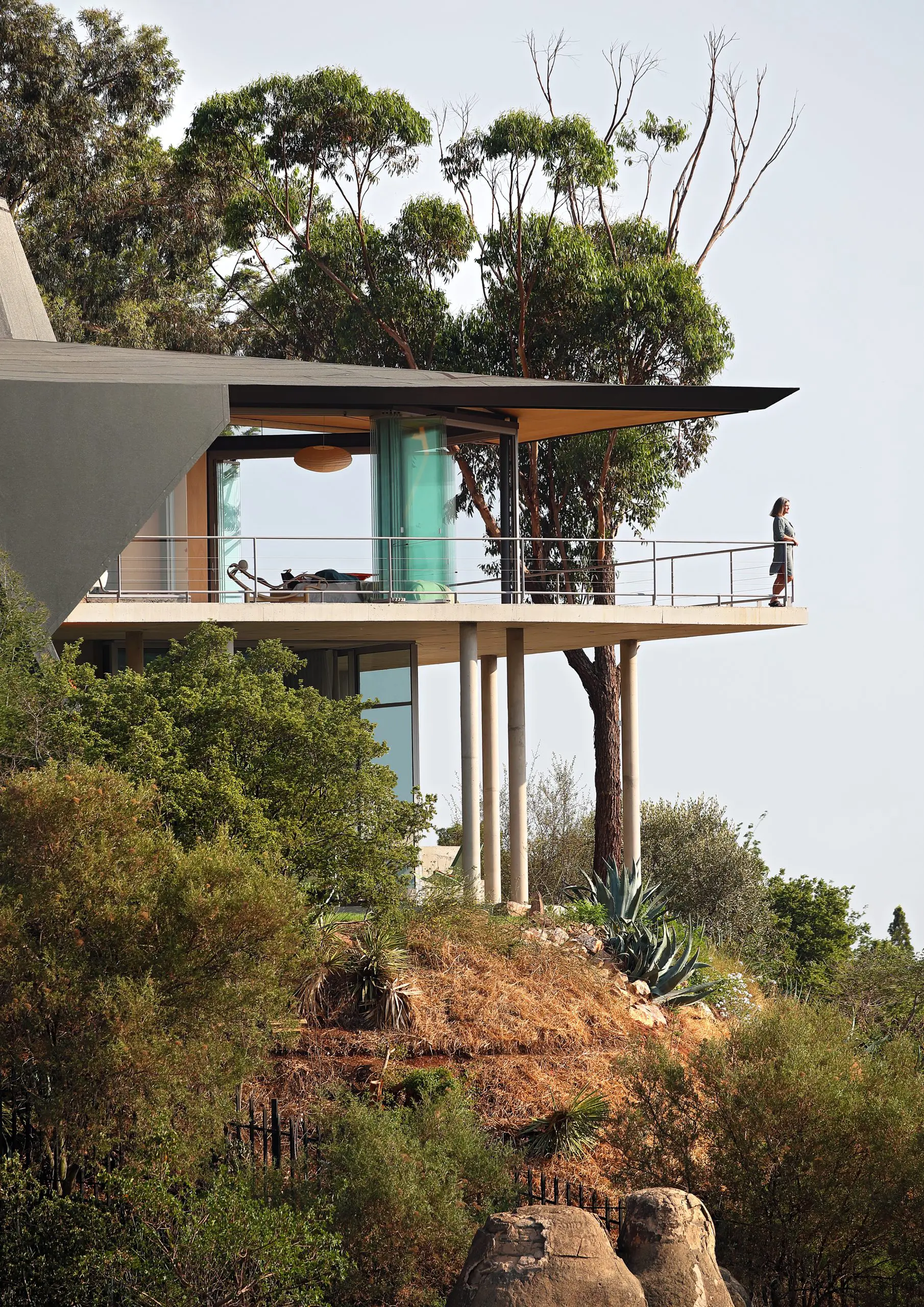 segundo nivel, “toma el espíritu Googie y continúa” al explorar el lenguaje del techo en zigzag, una evidente escultura angular y prismática, algo así como un cruce entre un bombardero sigiloso y “un tablero de Lamborghini de las primeras épocas”. Lo remata una claraboya cónica facetada. Todas las áreas de esta casa están unidas por la uniformidad de los materiales. Las terrazas y columnas de concreto contrastan con la calidez de los pisos y techos de roble rubio. Los pasamanos de hierro galvanizado, sin adornos, y la escalera de caracol, también celebran su materialidad honesta e insinúan temas náuticos, “festejan el agua, la piscina y el reflejo”.