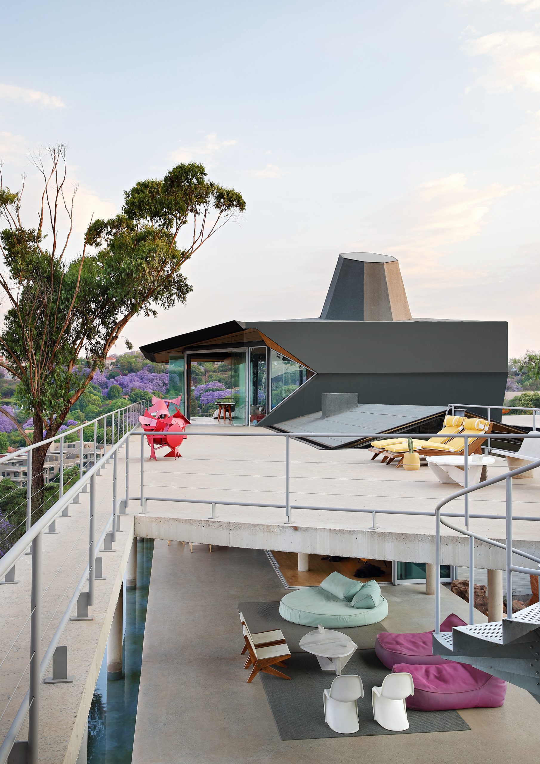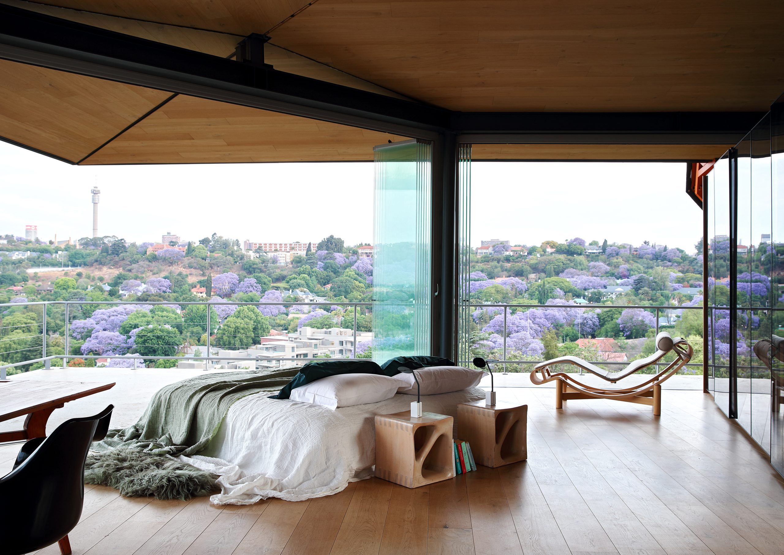 Dos terrazas gemelas atraviesan el frente de esta casa, que pertenece a los arquitectos sudafricanos Silvio Rech y Lesley Carstens, para aprovechar una vista de 270 grados sobre las copas de los árboles de un enorme bosque en Johannesburgo. El impresionante panorama abarca una línea de tiempo que recorre la historia de la arquitectura de esta ciudad sudafricana.