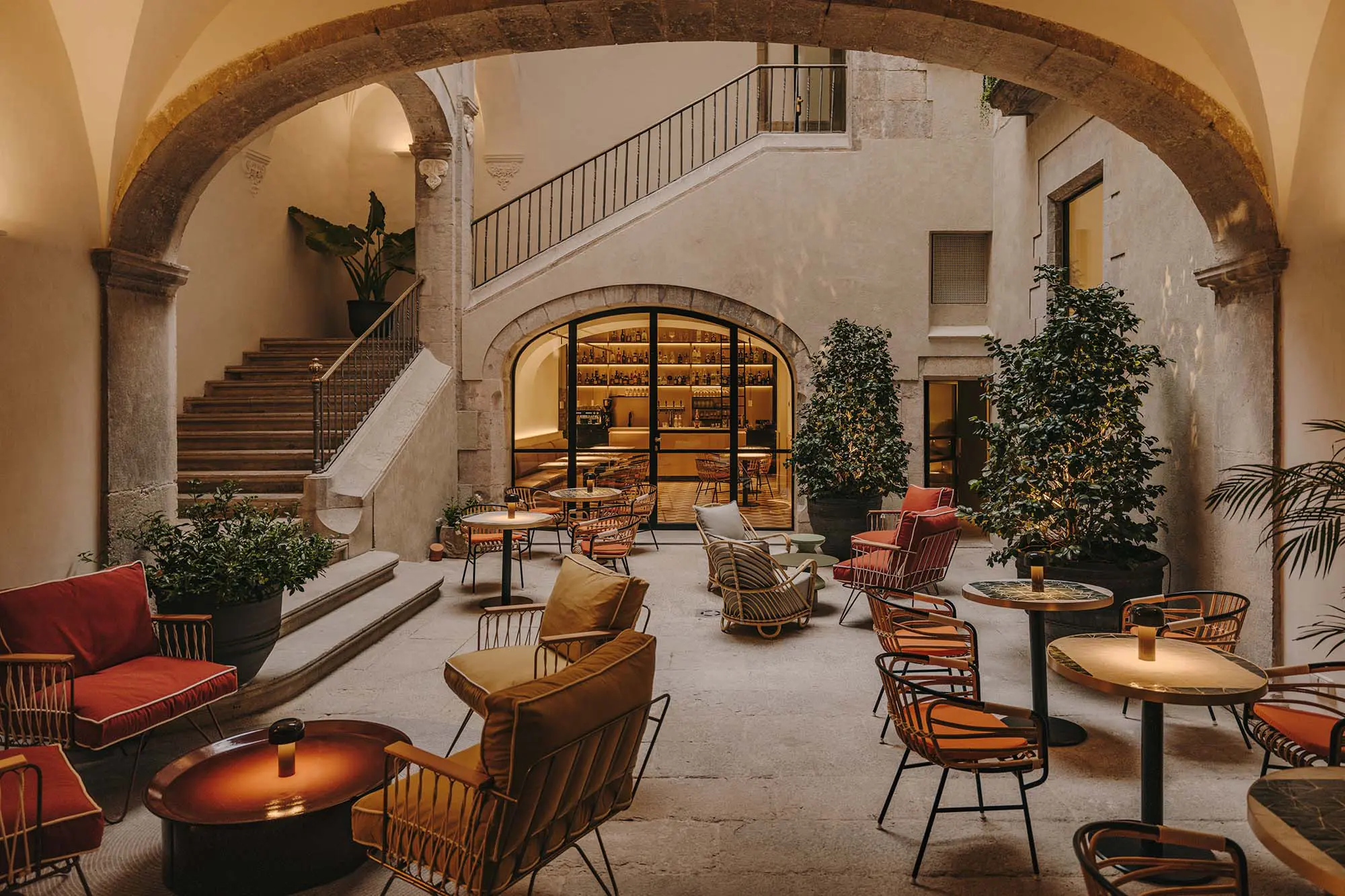 Palau Fugit, como se llama, se despliega en dos alas principales, ambas adaptadas a las necesidades de los viajeros por el estudio de arquitectura Isern Associats. La primera es el palauet original. Allí, un patio abovedado, rebautizado como La Placeta, alberga a su alrededor la recepción, el restaurante y el bar de cocteles, así como un spa oculto. Los huéspedes ascienden a las habitaciones por una escalera.