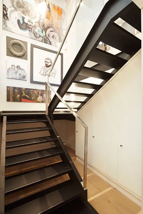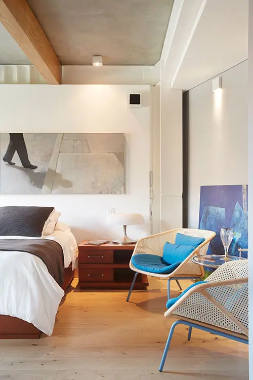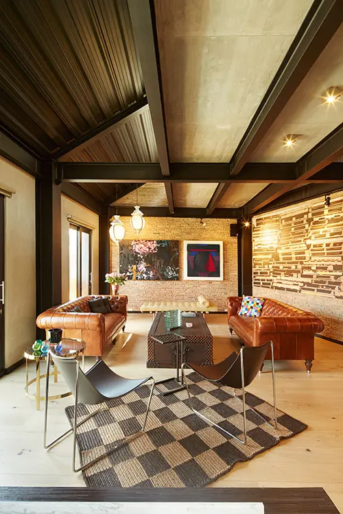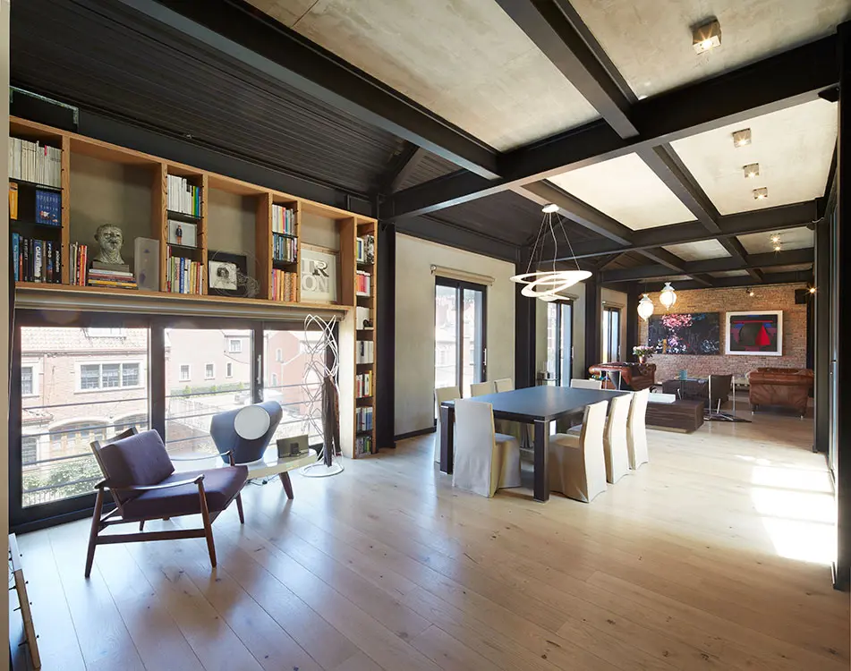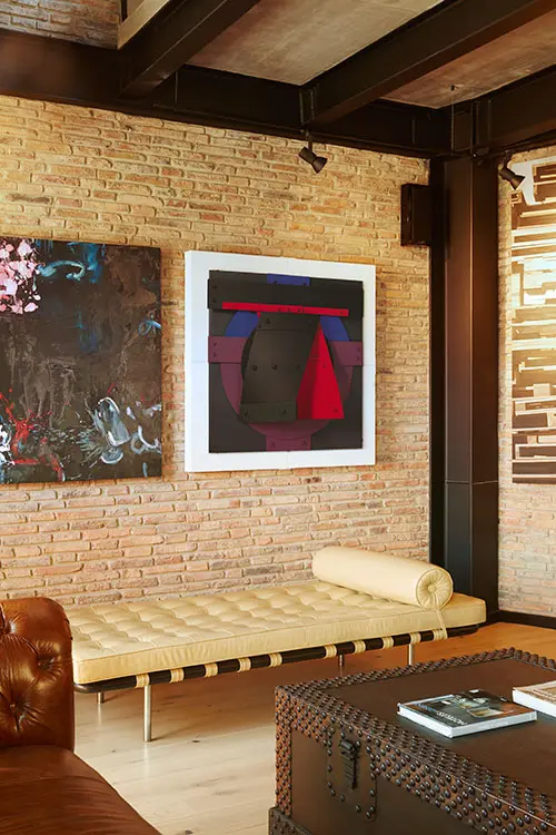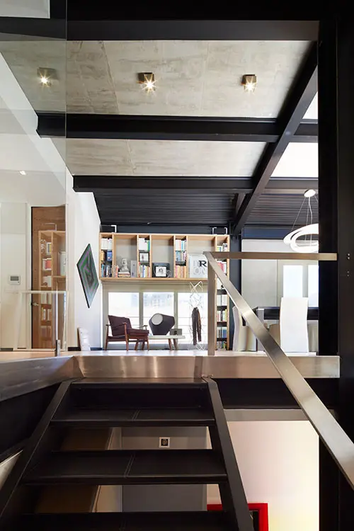 El piso de madera australiana de color marfil, los muros de ladrillo a la vista, la estructura de acero pintada de negro y el cielorraso en lámina plegada de acero en tono gris pizarra crean un ambiente cercano al de las mansardas de las casas bogotanas de los años treinta. Al bajar las escaleras con pasos de cuero negro, iluminadas por un vitral de doble altura de módulos cuadrados amarillos y azules, se llega al piso privado con dos grandes alcobas, cada una con baño y vestier. Por la escalera central del edificio se sube a la terraza, que se asoma a los tejados del barrio, a los cerros y al perfil urbano de Bogotá.