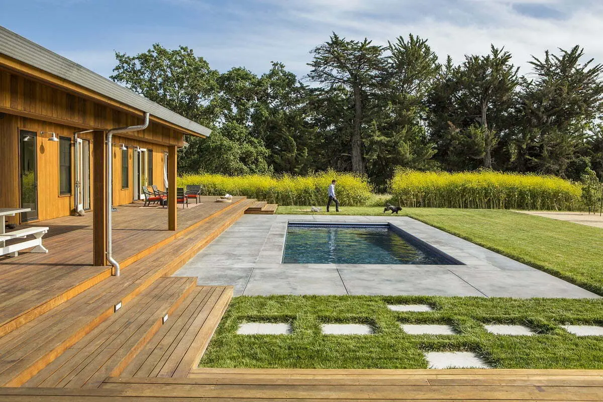Carlson diseñó esta escapada de fin de semana inspirada en una granja para su familia en Sonoma. Ubicada en un antiguo huerto de nogales, la casa de 1.885 pies cuadrados -junto con un granero de 600 pies cuadrados que funciona como estudio para su esposa artista- captura la experiencia del camping californiano. Al igual que los edificios agrícolas de la zona, la casa se asienta humildemente en el paisaje. Carlson situó la casa a lo largo de un eje este-oeste para permitir la entrada de luz natural, y todas las habitaciones de la casa tienen acceso al exterior. Una terraza de madera en forma de L conecta la casa y el granero, mientras que un porche cubierto se situó para crear un lugar fresco donde poder escapar del calor del sol de las tardes de verano.