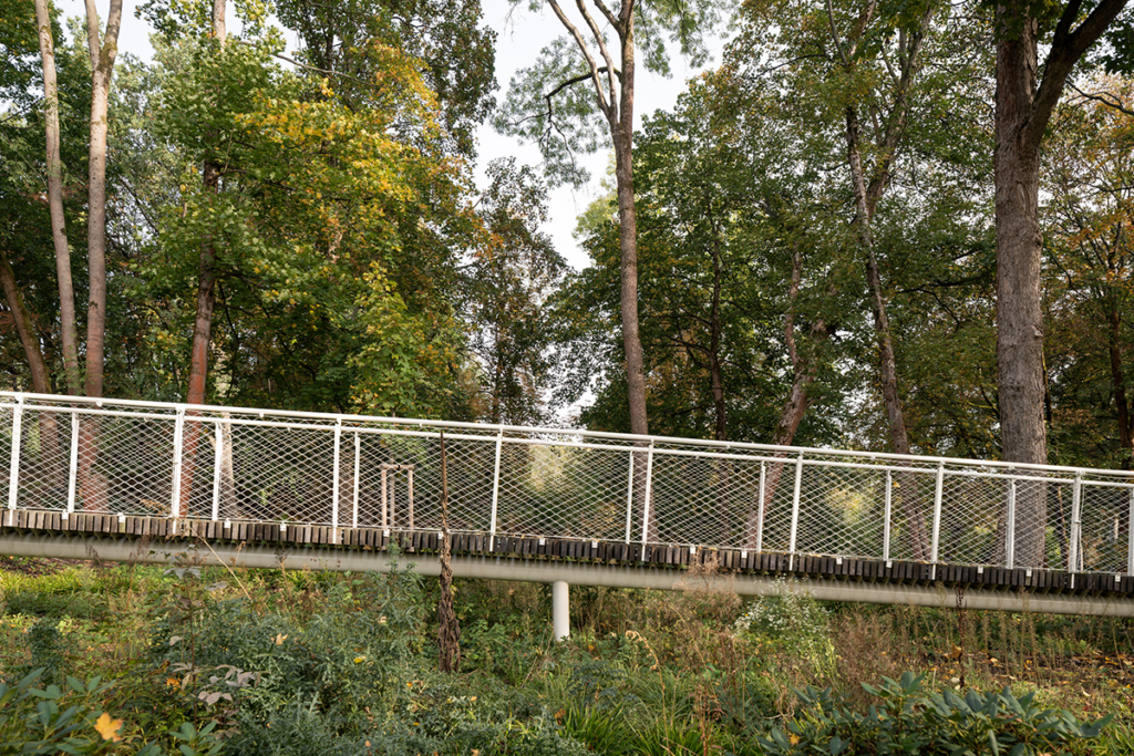 Otro punto especial dentro de la arquitectura de este sitio es un nuevo elemento que crea un camino paralelo a través del parque es una pasarela. La combinación atípica de una estructura central de acero y madera crea una estructura sutil que serpentea por el parque. La pasarela está conectada a plataformas y pasarelas de madera. La nueva superficie del camino simbólicamente no toca la superficie del cementerio original.