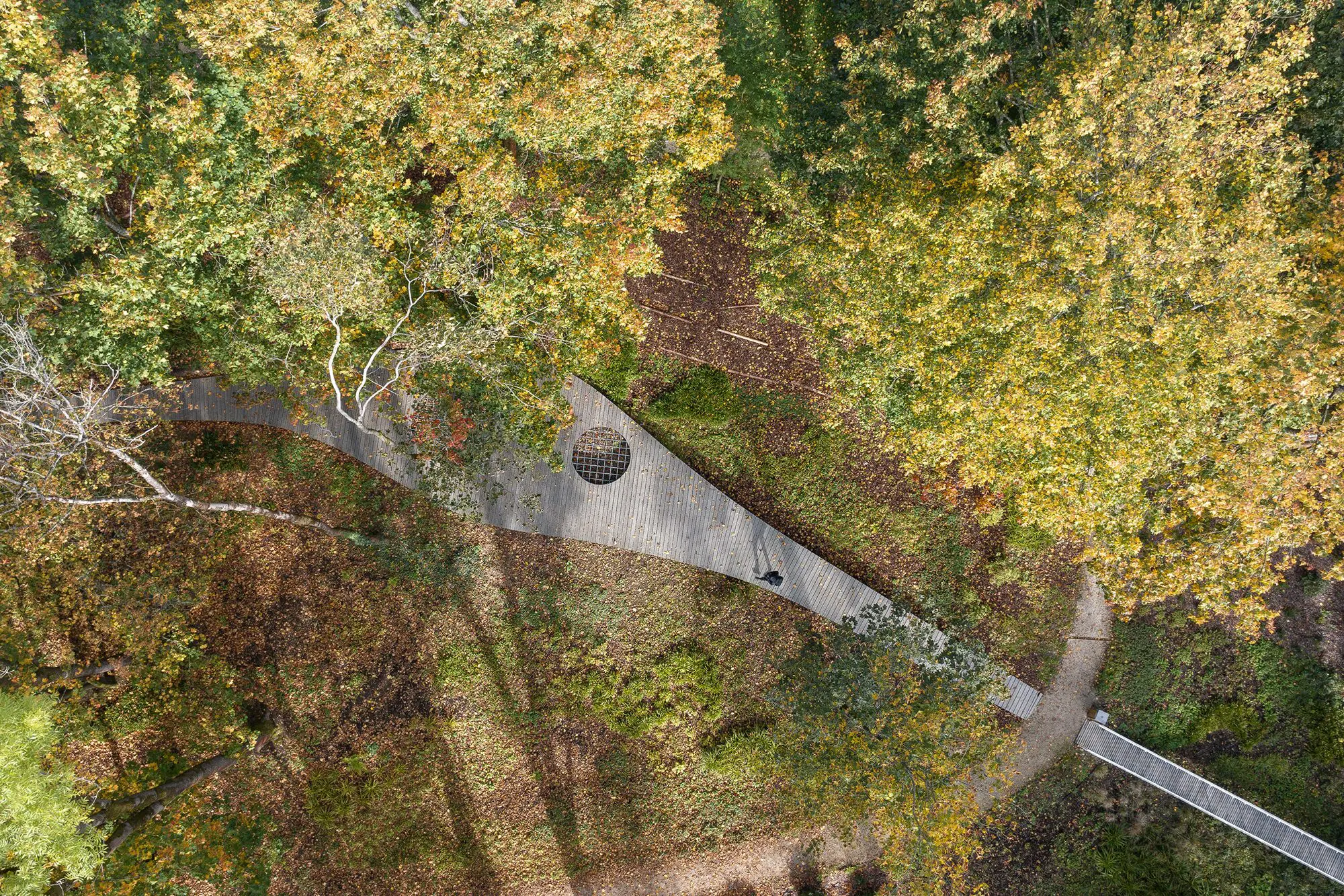 Otro punto especial dentro de la arquitectura de este sitio es un nuevo elemento que crea un camino paralelo a través del parque es una pasarela. La combinación atípica de una estructura central de acero y madera crea una estructura sutil que serpentea por el parque. La pasarela está conectada a plataformas y pasarelas de madera. La nueva superficie del camino simbólicamente no toca la superficie del cementerio original.