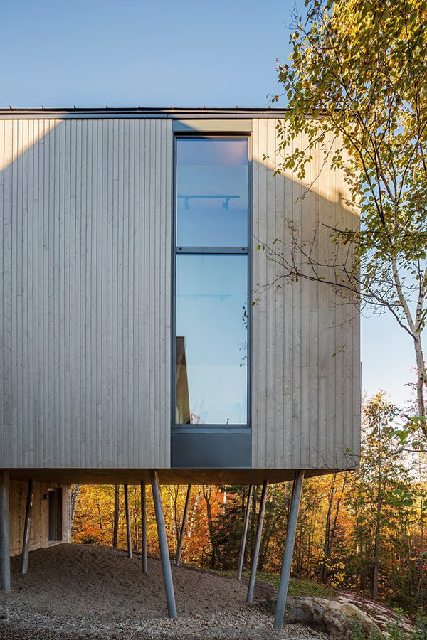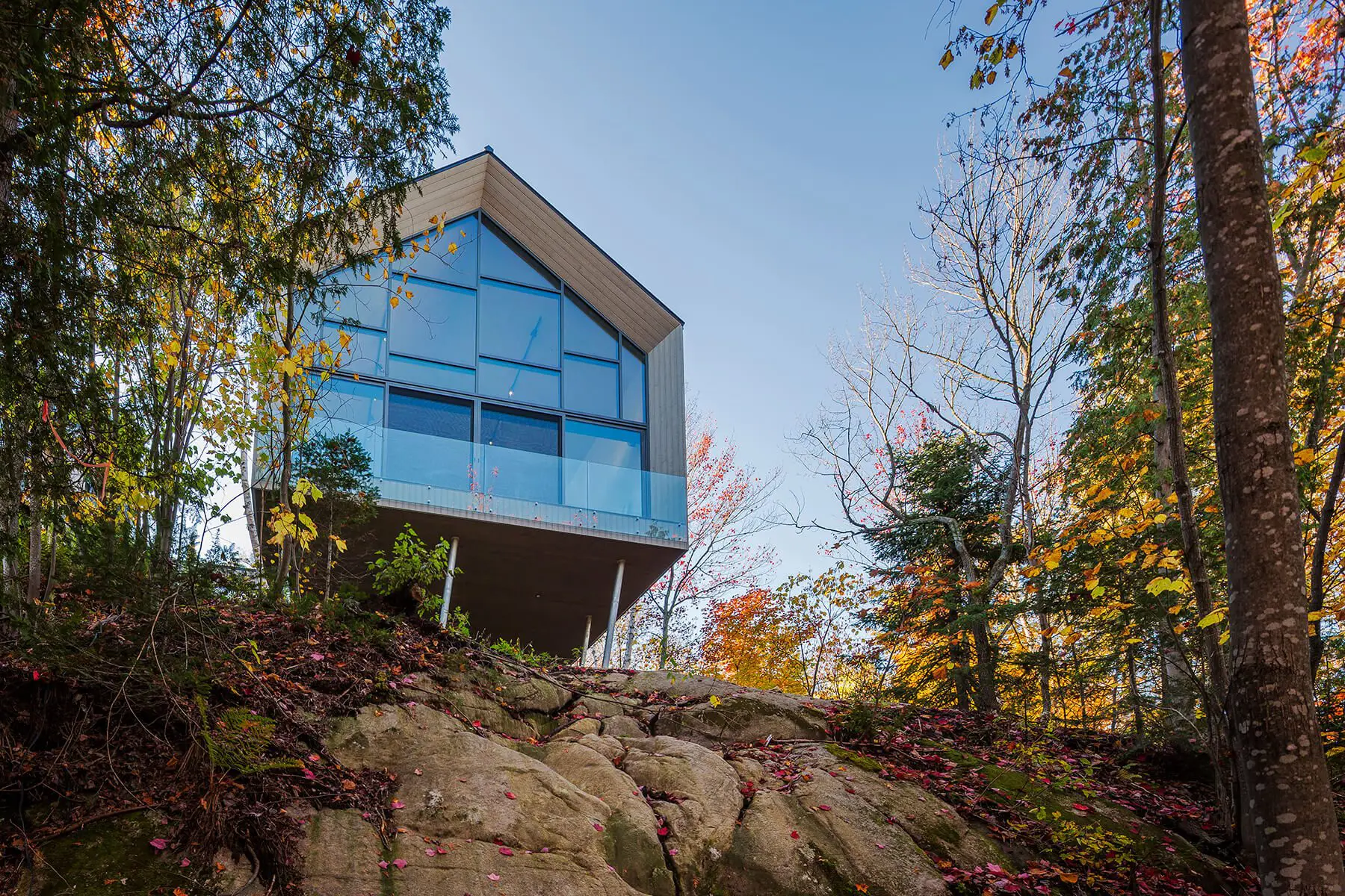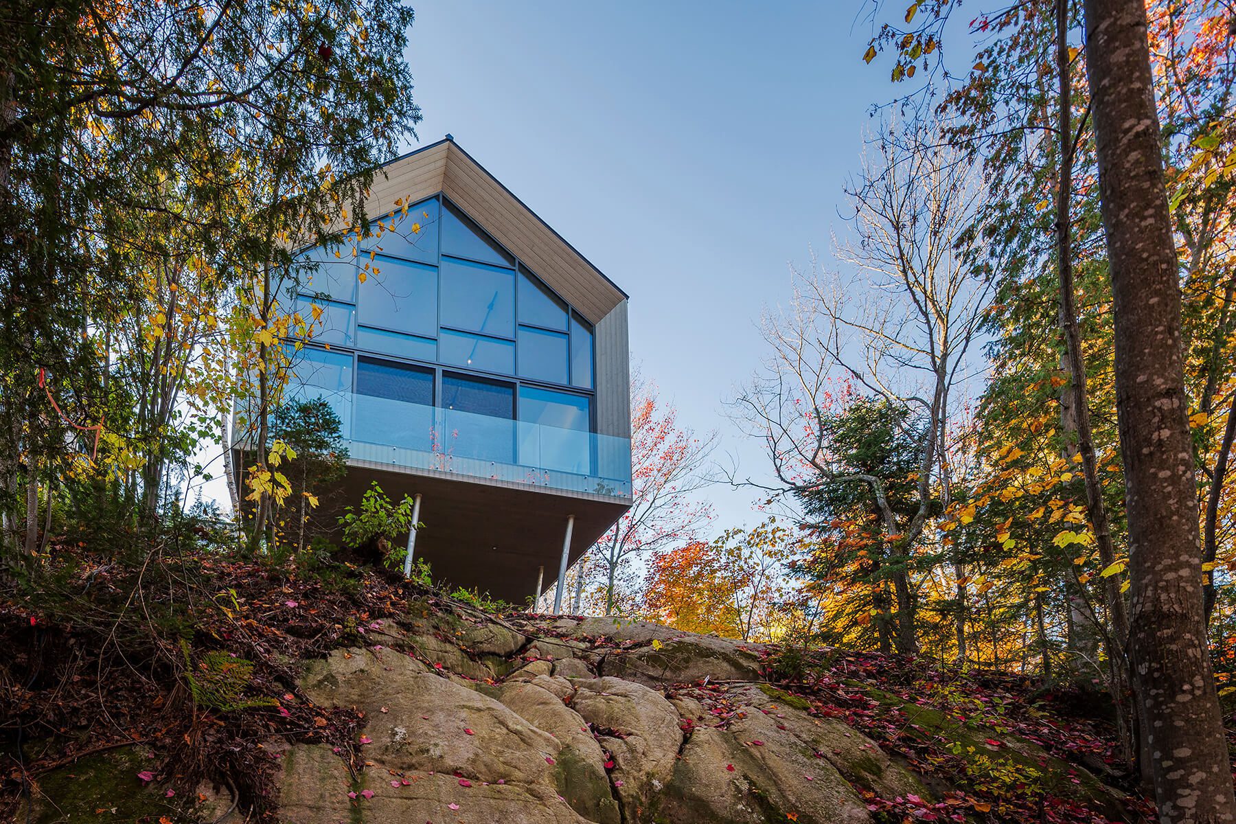Un garaje contemporáneo que se convierte en un estudio de artista suspendido. Con reminiscencias del granero típico, esta gran adición moderna se transforma en una obra arquitectónica que se proyecta sobre los acantilados de un lago. Cubre más de 5000 pies cuadrados y alberga dos garajes superpuestos, un taller, una gran sala creativa y un entrepiso.