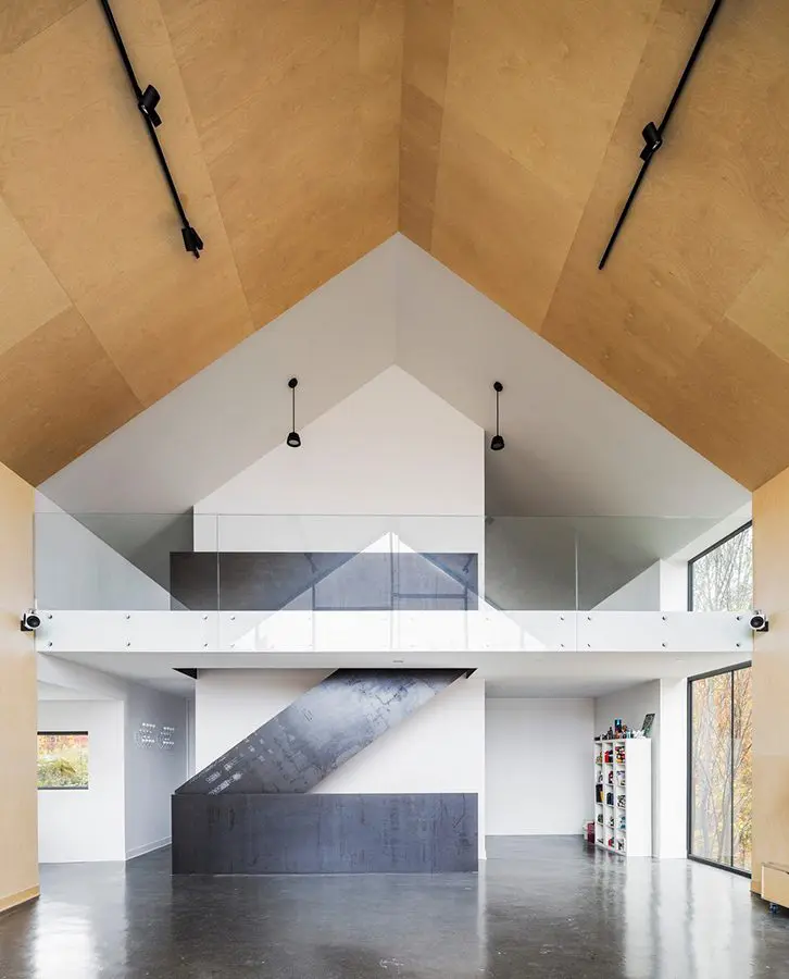 El taller se desplaza sobre un bosque de columnas inclinadas conectado a la residencia principal por un puente en voladizo, el estudio se define como un poderoso espacio para la reflexión y la creación. Su estructura, completamente libre, descansa sobre un conjunto de columnas inclinadas que evocan el bosque, suspendiéndolo por encima de la línea de árboles.
