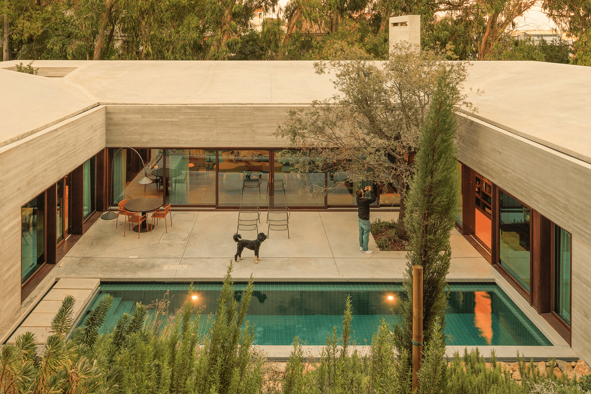 La espacialidad generada permite que la casa fluya con el terreno, evitando la imposición y abrazando el entorno. A pesar de su anclaje en la pendiente, la edificación parece levitar, dejando que la vegetación continúe su recorrido entre el exterior y el interior del patio.