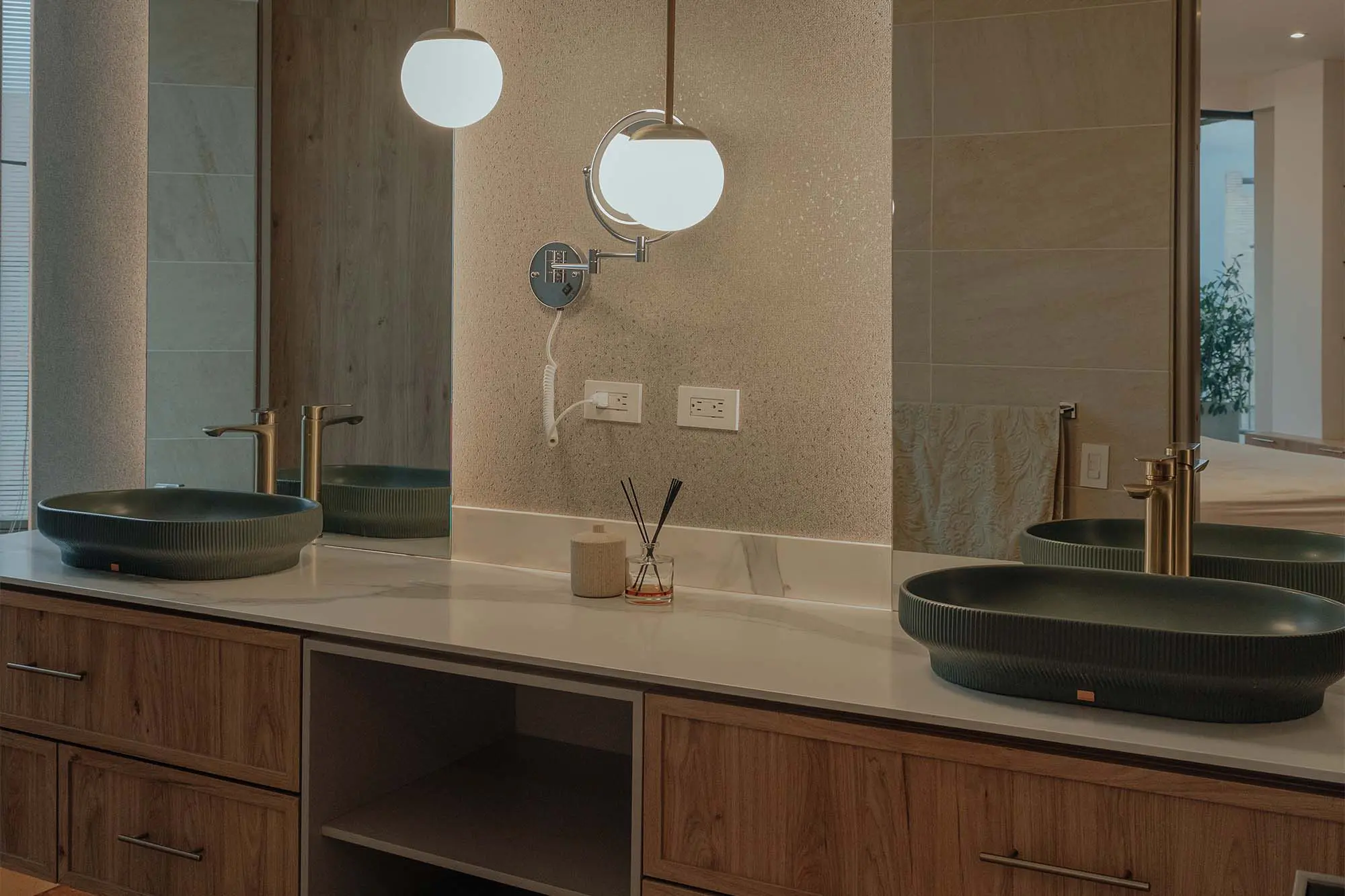 Este espacio se articula alrededor de una composición simétrica, en la que los lavamanos de concreto en tono verde son los protagonistas. Estos últimos descansan sobre un mesón de cuarzo blanco, con vetas grises muy sutiles.