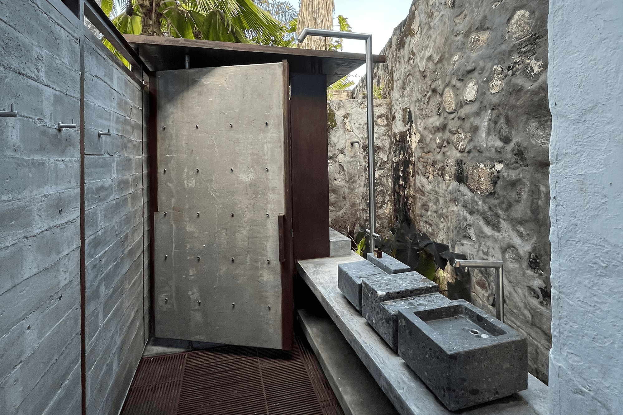A continuación, se encuentra la ducha con una grifería de piso en acero inoxidable, construida sobre el mismo poyo, y un suelo en deck de hierro oxidado. Al final, el sanitario, protegido por una cubierta muy etérea, casi flotante, de lámina de hierro. Todos estos elementos se fabricaron en el taller de Octubre Arquitectura.
