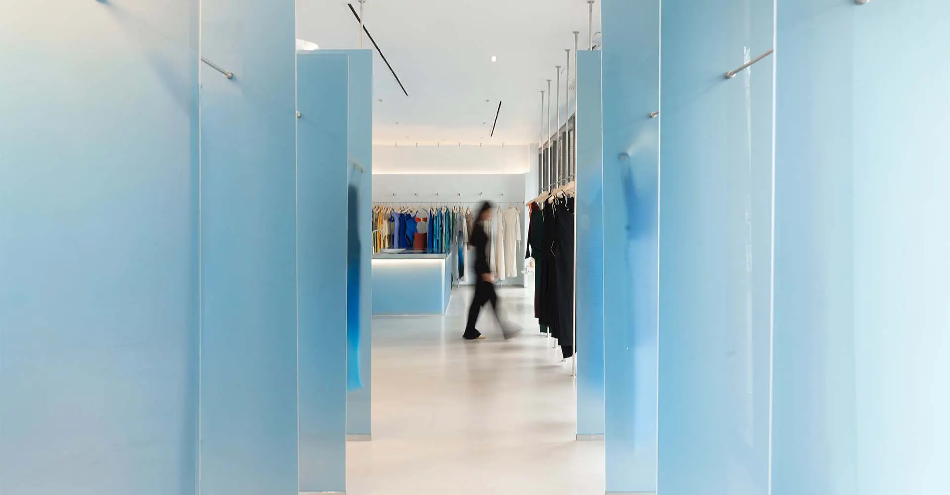 El proyecto parte de la idea de “concebir una tienda monocromática, donde el azul fuera el protagonista y la experiencia espacial evocara la sensación de estar bajo el agua”, explica Juan Carlos Naranjo, arquitecto y fundador de LAP.