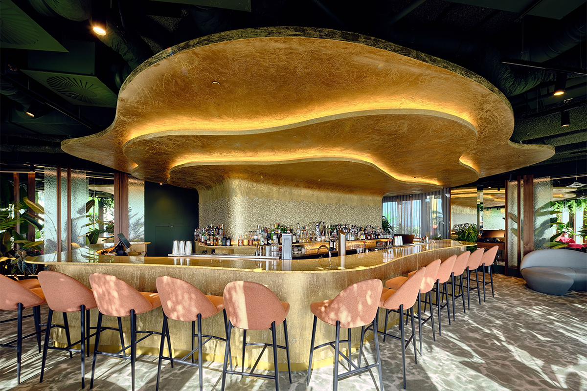 La forma curva y sofisticada del bar deslumbra en el centro del espacio, emergiendo como un ídolo dorado en un entorno misterioso de tonos verdes, exuberante vegetación y patrones acuáticos, un homenaje a los pantanos de las selvas latinoamericanas.