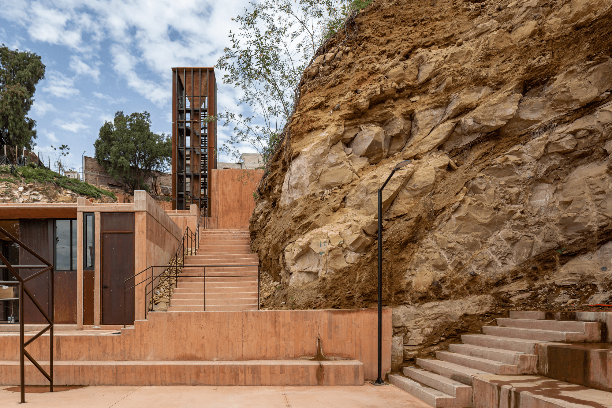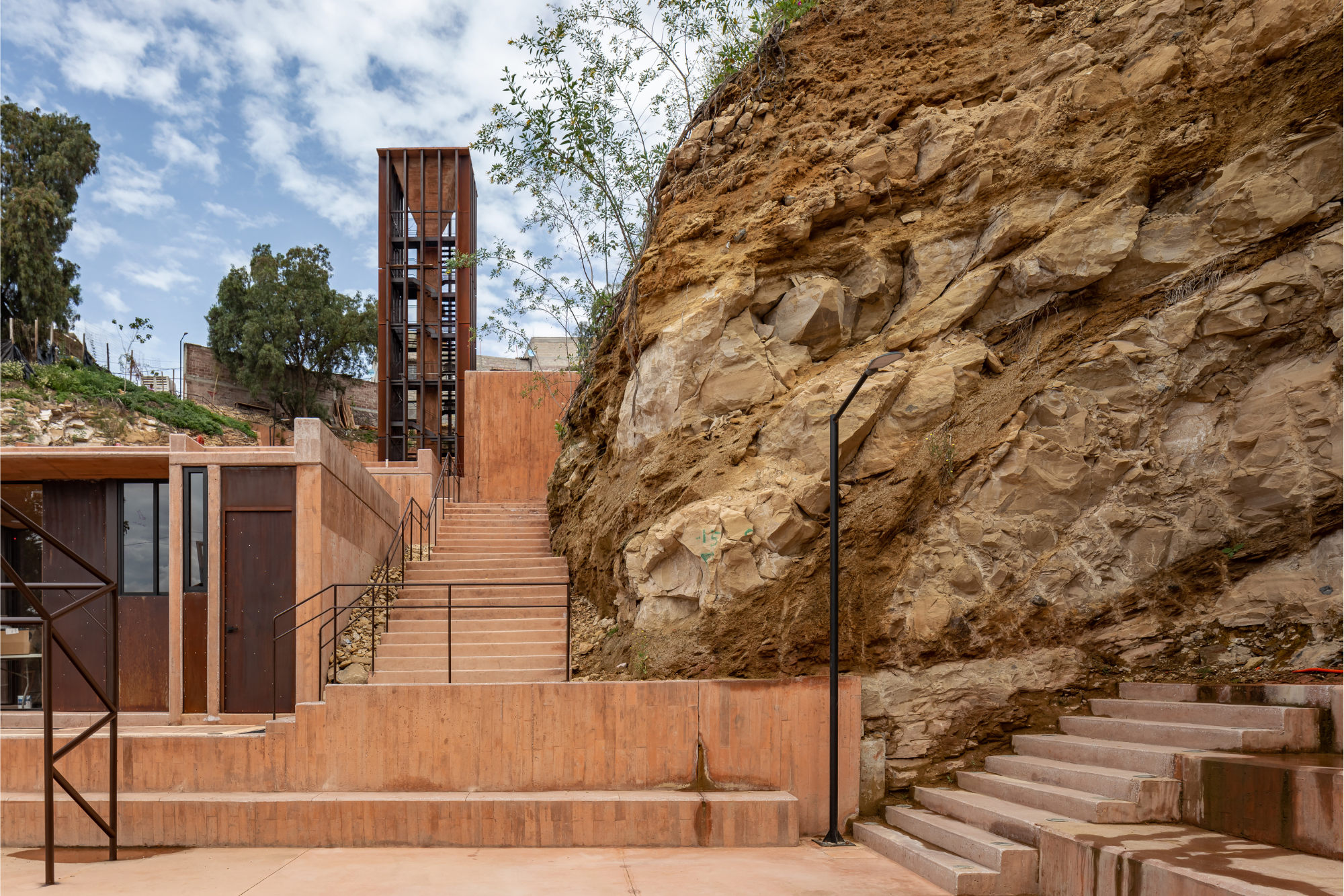 La pendiente natural del lote condujo a que la intervención se hiciera de manera escalonada. Una secuencia de terrazas descendentes dispone una torre de escaleras que sirve de mirador en la parte más alta, así como una biblioteca pública, un taller multipropósito para la comunidad, una garita de vigilancia y una placa polideportiva en el nivel inferior. Este sistema de escaleras abiertas sobre el terreno conecta las cuatro plataformas y permite recorrer el proyecto.