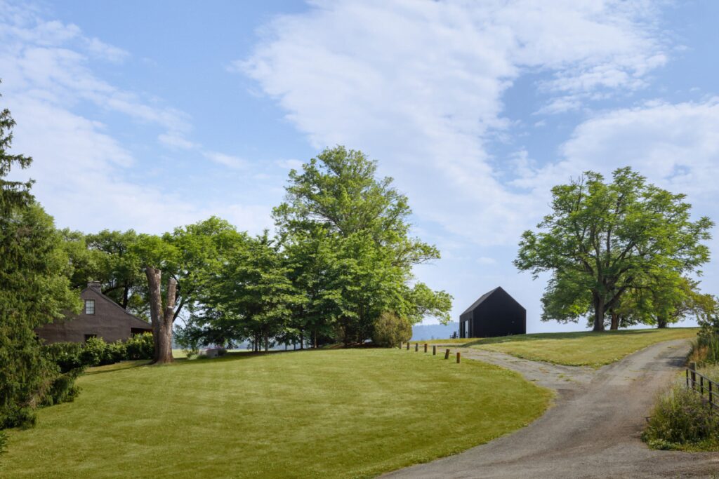 Así fue como después de estudiar la topografía del lote de 33 acres y las oportunidades de vistas de las montañas distantes hacia el norte y el oeste, la estructura se ubicó en el punto más alto del lote. Esta escondida entre un pasto, un huerto de manzanos, la cabaña existente y una segunda área de terreno donde se construiría una nueva casa en el futuro.