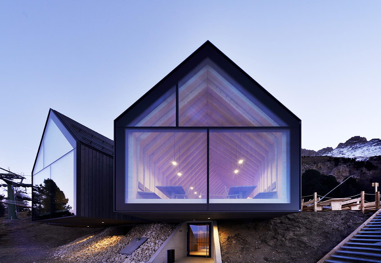 La forma y el método constructivo del techo están inspirados en las cabañas típicas de la zona, mientras que el sistema de bifurcaciones y la compleja estructura representan una interpretación nueva y contemporánea de la clásica vivienda de montaña. El ambiente interior está definido por la estructura de madera, que de manera gradual se funde con las paredes creando espacios más íntimos.