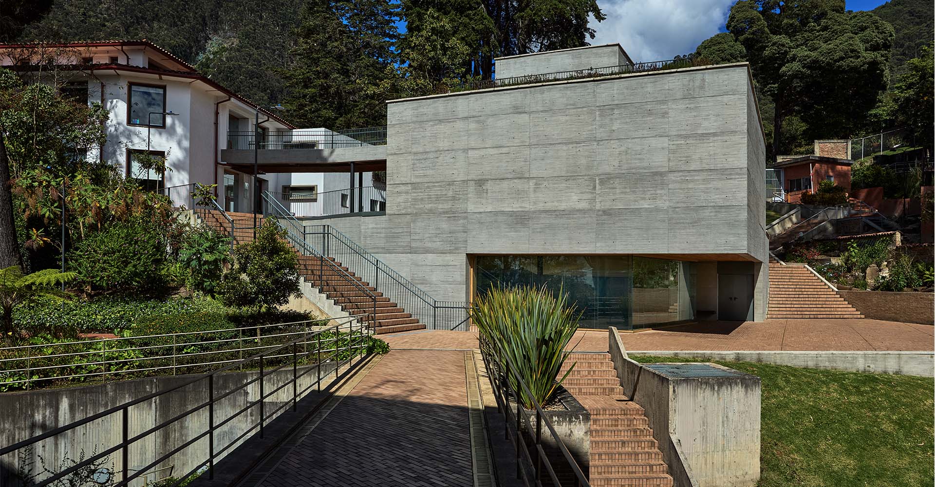En el exterior, el concreto adquiere un papel paisajístico. El color grisáceo del material se mimetiza con el cielo bogotano, mientras que las cubiertas verdes y los jardines de lluvia con especies nativas prolongan la topografía del campus.