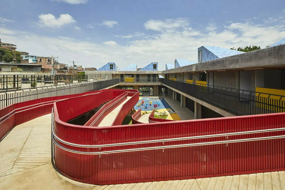 Una serie de cubiertas enchapadas en baldosas azules corona la construcción, al tiempo que una rampa roja se contorsiona en el patio para salvar la altura entre los dos niveles. Adentro, las aulas se distribuyen de tal forma que miren al barrio a través de balcones protegidos de las balas perdidas, frecuentes en Siloé, gracias a la persiana de hormigón.