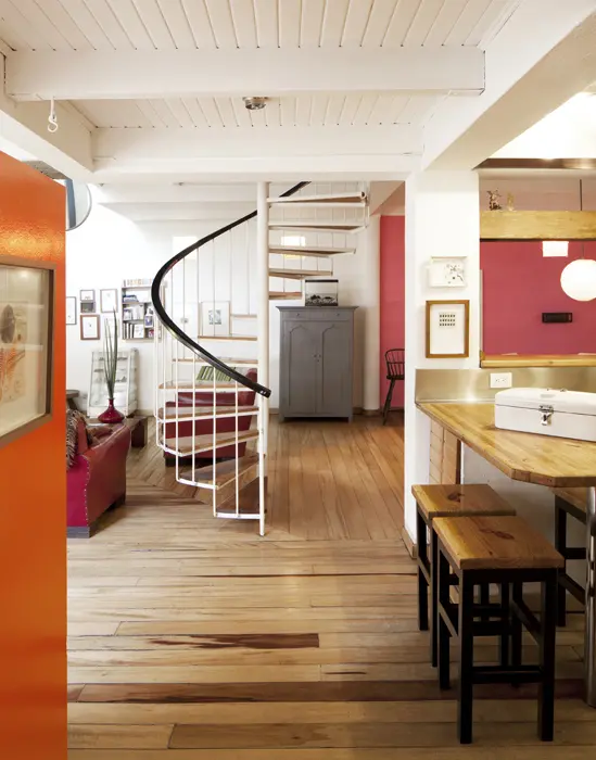 La experiencia con este producto se hace evidente en este proyecto anclado en el centro histórico de Bogotá, pues quien entra a la casa tiene la sensación de estar rodeado de este material duradero, vivo y agradable al tacto y a la vista, ya que sobresale en pisos, escaleras, mesas, mesones, vigas, soportes, puertas y ventanas. Por ejemplo, a medida que se recorre la escalera de caracol, se revela un juego de formas geométricas construidas en madera, que incluso es común en el mobiliario, pues muchos de los accesorios y muebles fueron diseñados en este material: la mesa del comedor y las de noche con base de metal; el escritorio y la cama de la habitación principal.