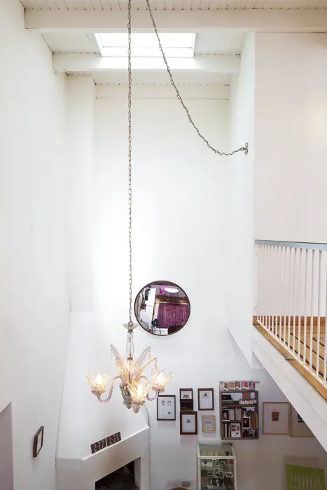 Un muro que divide la alcoba del baño sirve como soporte para exponer parte de la colección de arte del dueño.