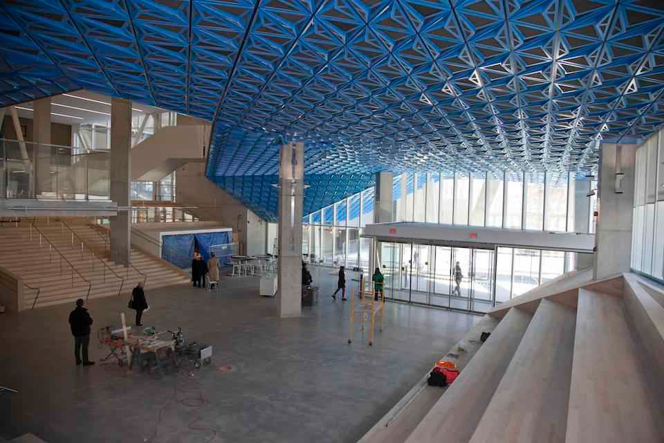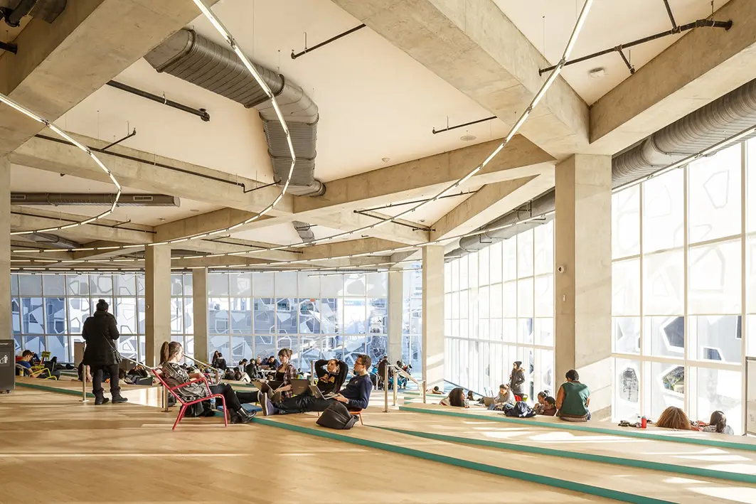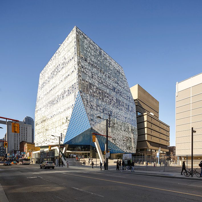 La nueva sede cuenta con una plaza elevada, un puente que conecta con la biblioteca existente y una serie de diferentes espacios académicos, de estudio y de colaboración. La firma noruega Snøhetta, que trabajó de la mano con el equipo de arquitectos de Zeidler Partnership Architects, logró darle una nueva identidad, más contundente y moderna a la universidad que se conecta mejor con el entorno urbano.