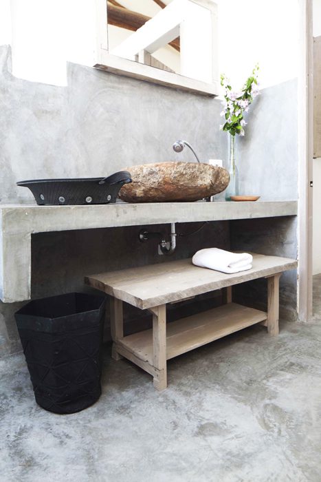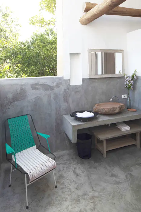 El clima de Barichara exige una apropiada circulación de las brisas y un seguro manejo de los aleros para protegerse de las fuertes lluvias que ocurren. Sin embargo, la temperatura agradable permite que los baños sean abiertos. Estos tienen mesón de concreto con lavamanos de piedra tallada en Barichara, grifería independiente y flexible, un espejo dilatado del muro y un nicho. El piso no presenta divisiones.