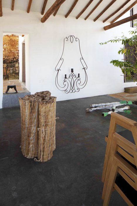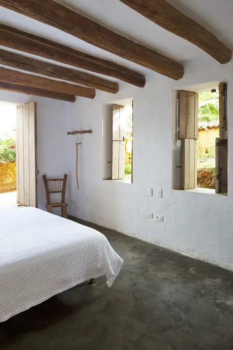 La estructura se armó con tres volúmenes distintos, que se conectan sutilmente: la zona social (ubicada en la parte alta del lote), la cocina y las habitaciones. Los cimientos son de piedra, los amarres de concreto y los muros de tapia pisada, como es tradición en el pueblo, lo cual da una lectura de volúmenes masivos, fuertes y con espacios generosos. Las cubiertas son de madera rolliza con caña brava o chusque y teja de barro de demoliciones que ya está curada y tiene propiedades impermeabilizantes.