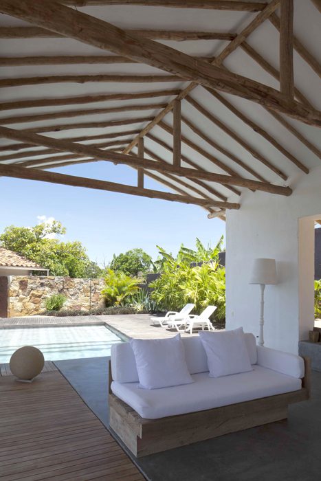 El espacio social es ancho y largo con una cumbrera alta, basado en los principios de un caney –lugar cubierto donde se seca el tabaco a dos aguas–, un volumen que tiene ritmo aunque no es modular. El comedor, libre en tres caras, da a la cocina y su forma en “U” se hizo en cemento con un mesón de concreto brillado.