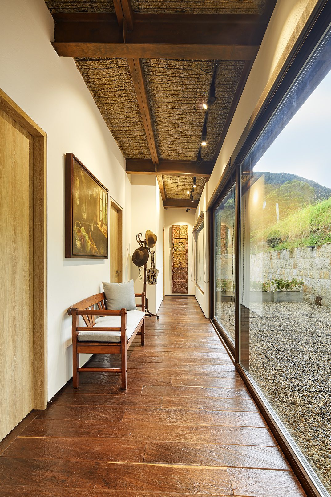 El bloque perteneciente al área privada de esta casa en las afueras de Bogotá, situado un nivel más bajo que el de la zona social, alberga las habitaciones, a las cuales se accede por un corredor ubicado en el eje de la fachada posterior, cuyos vanos apuntan hacia la profusa vegetación de las montañas. Incluso desde las alcobas es posible admirar la unión entre dos montañas, sobre la cual se extiende un camino rodeado de nogales.
