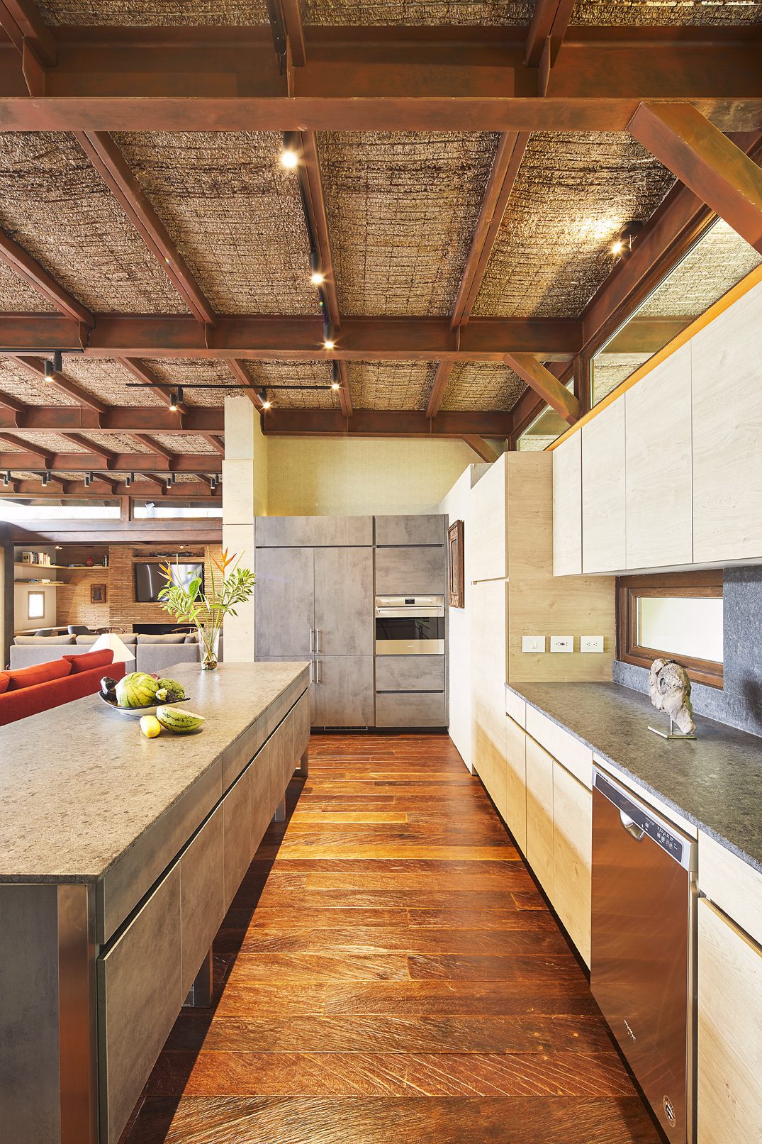 El segundo cuerpo, sostenido mediante pórticos metálicos conformados por vigas, permite grandes luces y con ello mayor amplitud. La cubierta, que se eleva 40 centímetros sobre el borde de la fachada principal, está compuesta por una malla con vena y una placa liviana de cemento con manto impermeabilizante. “Sin duda, la riqueza espacial está dada por la cubierta elevada que facilita el ingreso de la luz natural”. Adicionalmente, tanto las vigas y los durmientes, como la malla con vena, se oxidaron con la intención de resaltar los tonos ocres y las texturas rústicas, que aportan calidez al ambiente.