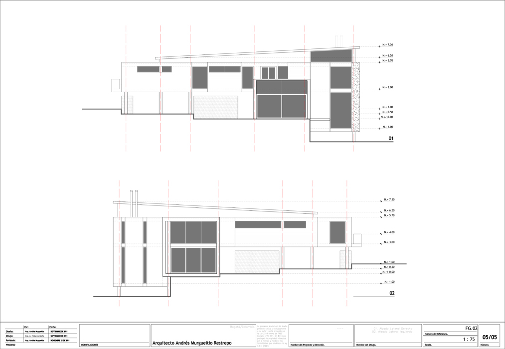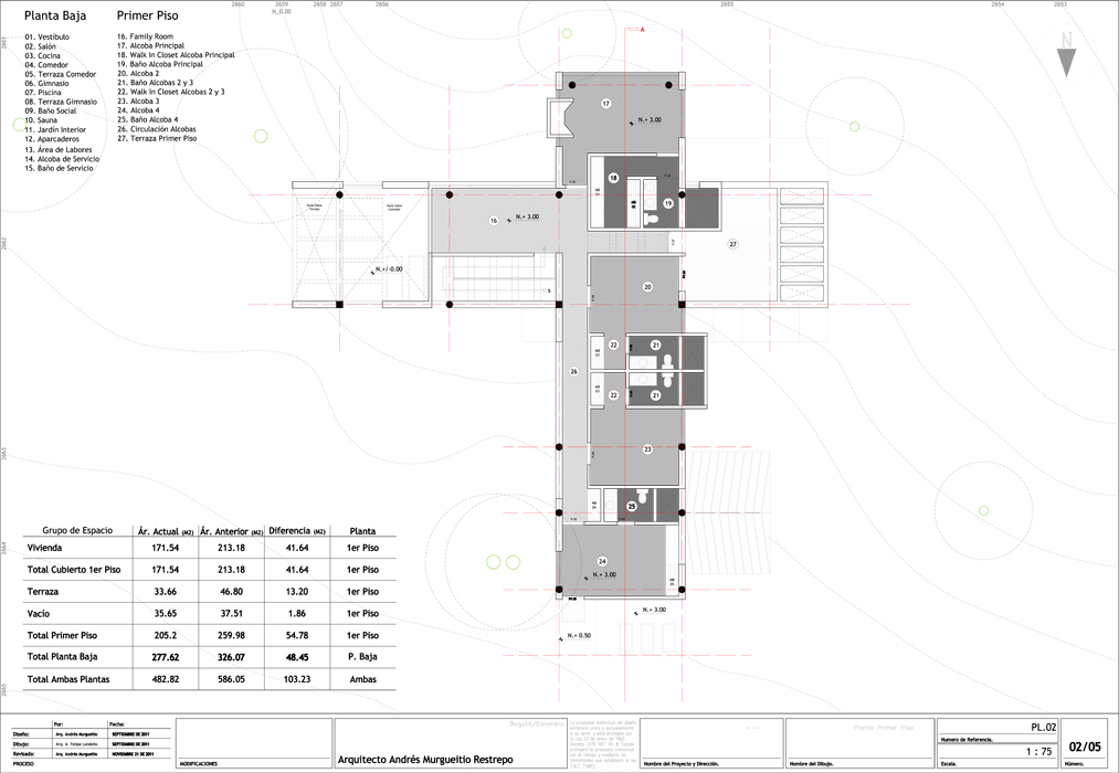 En el primer piso, el tramo de la entrada y los garajes separan la zona de servicios del nivel de actividad social, donde un vestíbulo de ingreso distribuye a la sala, medio piso más abajo, con un amplio ventanal sobre la montaña y la sabana.