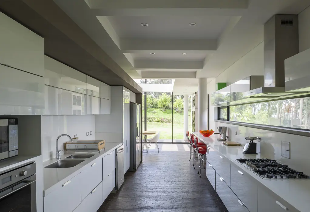 A la derecha están el gimnasio y la piscina, abiertos al sol del poniente, y a la izquierda, la cocina en corredor y el comedor de doble altura con puertaventanas de vidrio y marquesinas que permiten una abundante entrada de luz y calor, especialmente en la mañana.