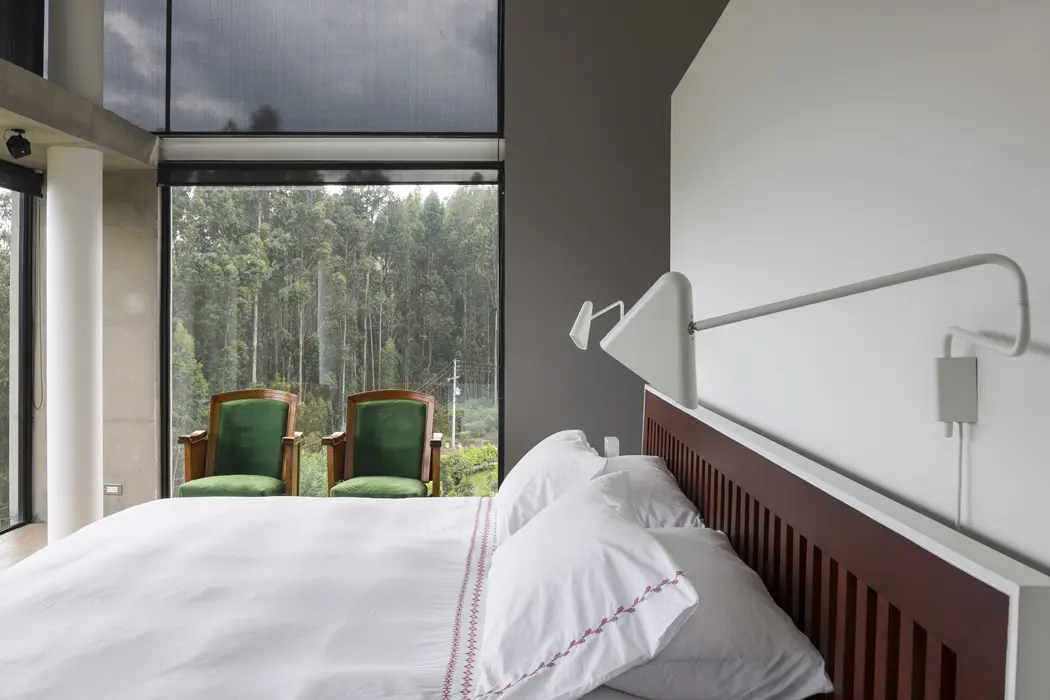 El efecto de la pendiente de la cubierta resulta en la doble altura de la habitación principal, con una chimenea semejante a la de la sala y un impresionante despliegue de ventanas de piso a techo que la convierten en un mirador sobre el bosque y la pradera.