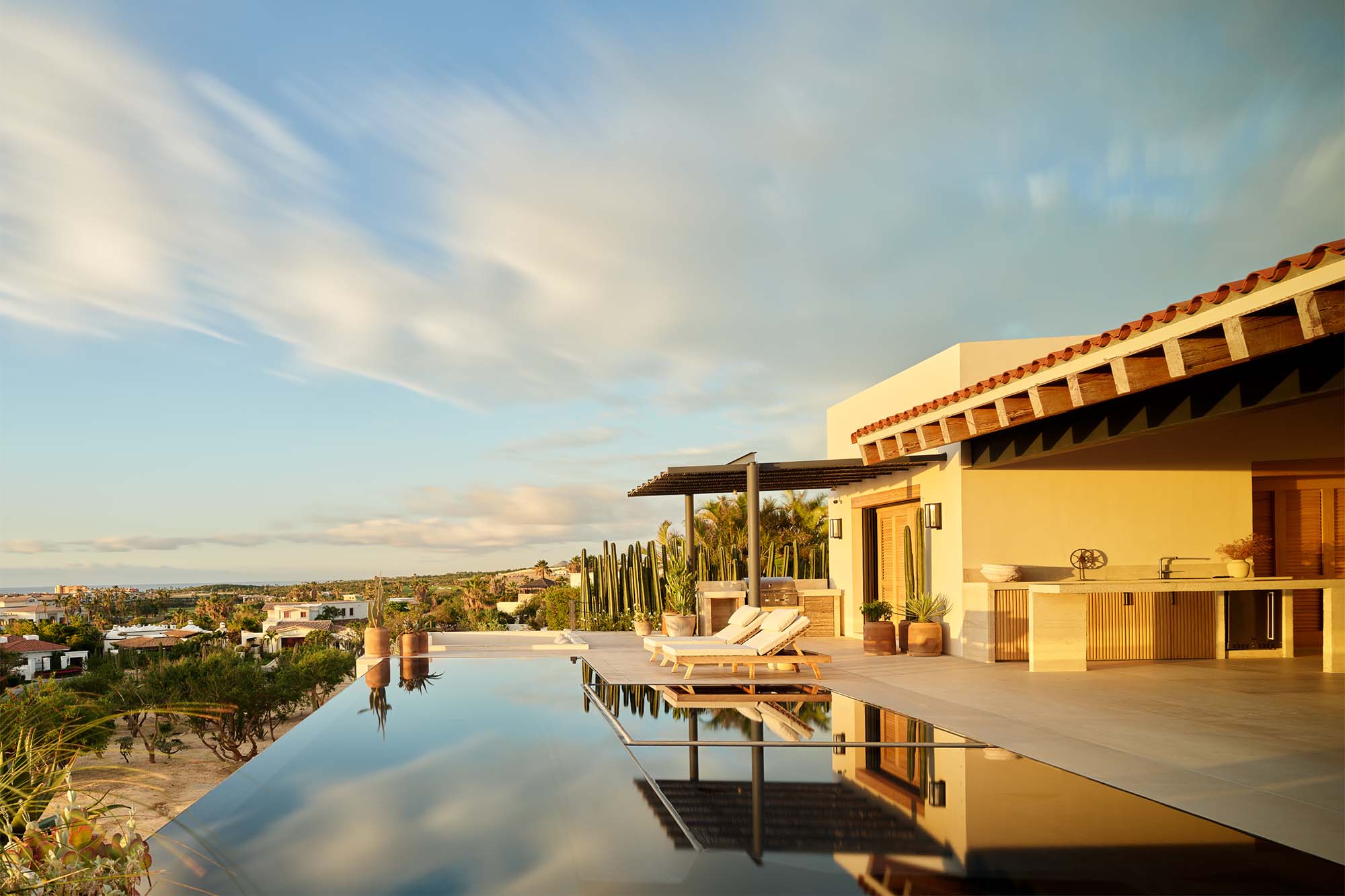 Aquí, la piscina funciona como un espejo del cielo y un eje visual que prolonga la casa hacia el horizonte. Desde allí, el paisaje entra a través de terrazas, umbrales y patios intermedios, eliminando los límites entre interior y exterior.