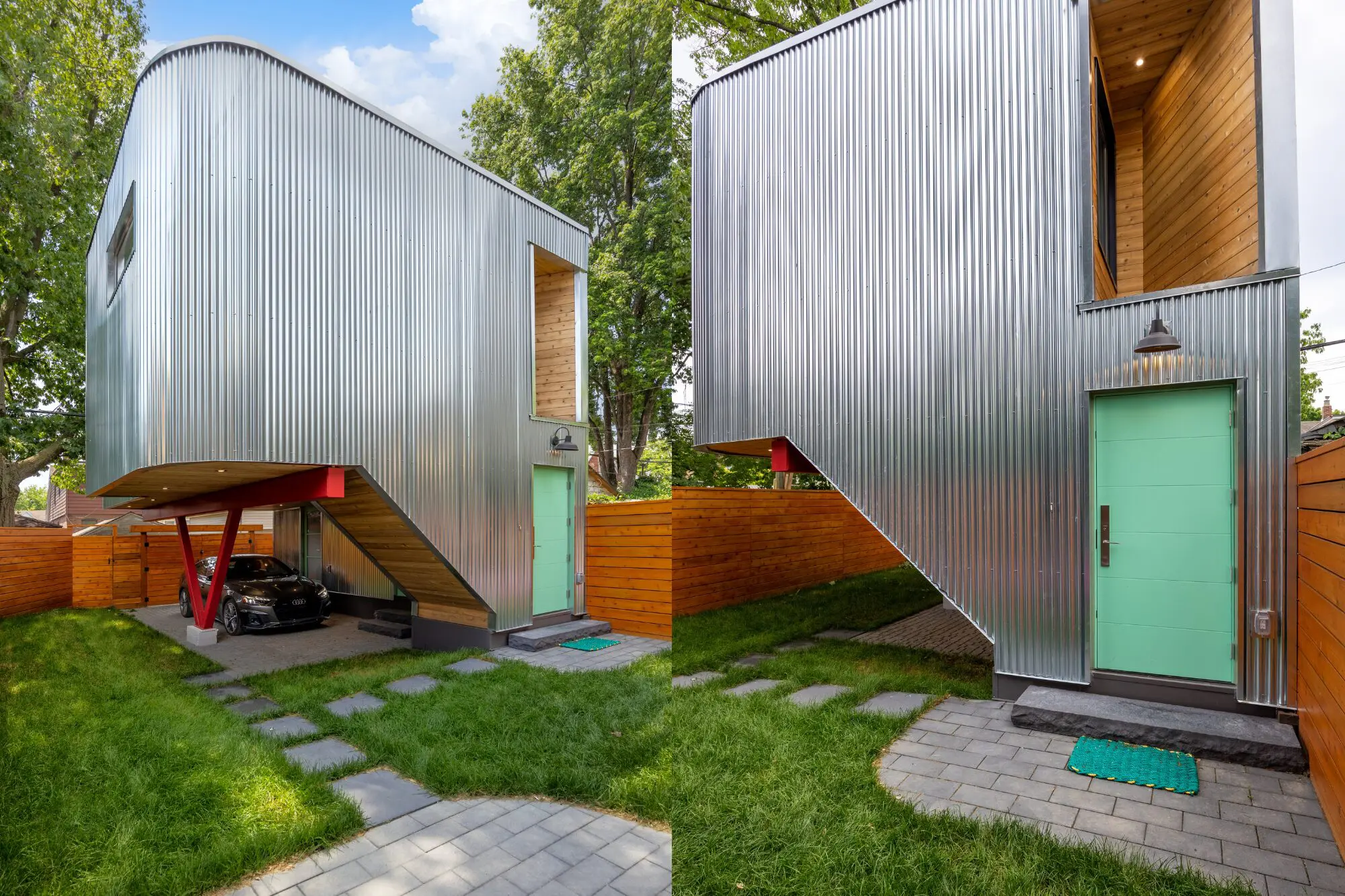 Casa Pocket Laneway es un proyecto ubicado en Toronto, Canadá, que se alza sobre una cochera, apuntalada parcialmente por una columna de acero en forma de V sobre pilares helicoidales. La llamativa estructura, similar a la de una casa en el árbol, no es nada arbitraria: al minimizar el contacto con el suelo, la residencia preserva la salud de las raíces de un arce maduro en este terreno limitado.