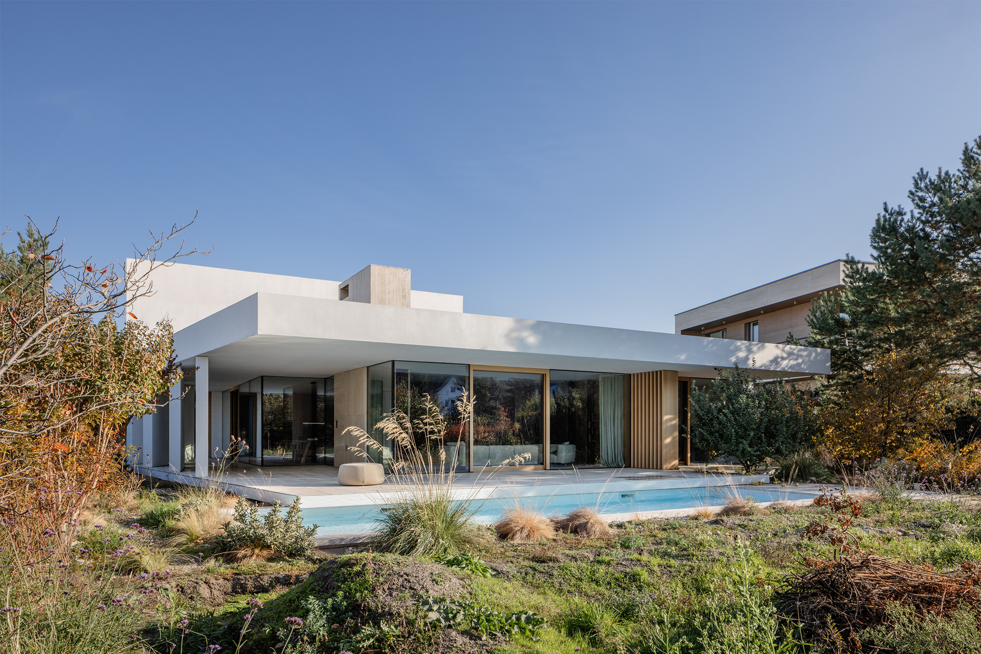 Desde la encimera de la cocina, la vista se extiende hacia los majestuosos pinos de la región de Záhorie, mientras que las terrazas se organizan siguiendo el recorrido del sol: la del este, ideal para disfrutar del café matutino; la del oeste y el sur, protagonistas de las tardes con piscina y encuentros al aire libre.