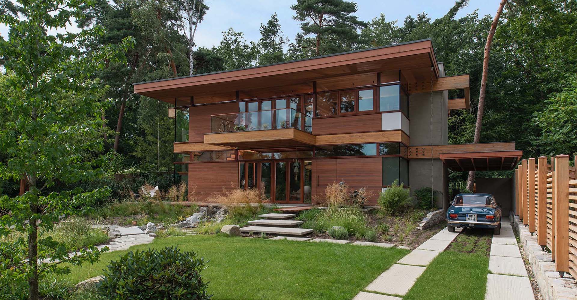 Enclavada en el paisaje verde y apacible de Kleinmachnow, a tan solo unos minutos de Berlín, se levanta una casa que parece flotar entre dos mundos: la calidez del modernismo californiano y la serenidad de la campiña alemana.