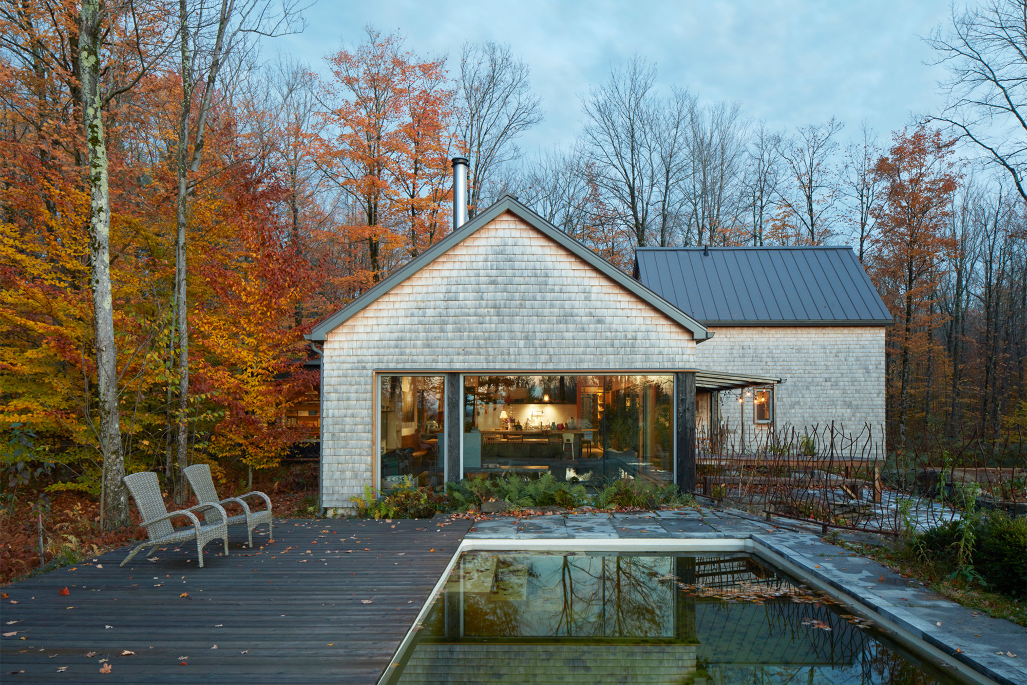 Esta residencia está compuesta por tres secciones, incluyendo un gran espacio habitable estilo catedral y un bloque de cabañas de dos pisos, la casa está revestida con una combinación de tejas de cedro y shou sugi ban, una madera carbonizada utilizando una antigua técnica japonesa que le da al material un tinte y una textura únicos al tiempo que aumenta su resistencia al fuego, insectos, hongos y moho.