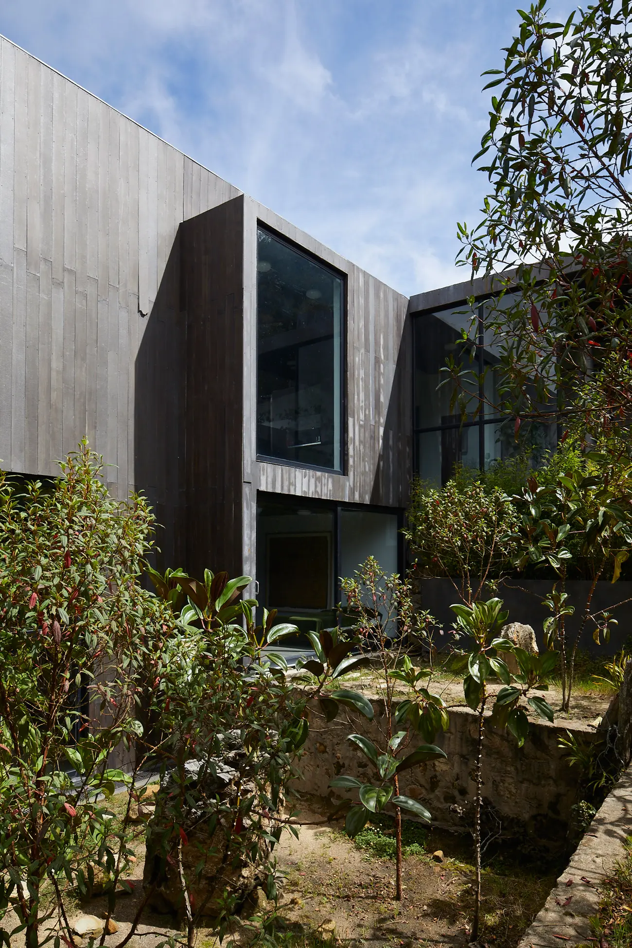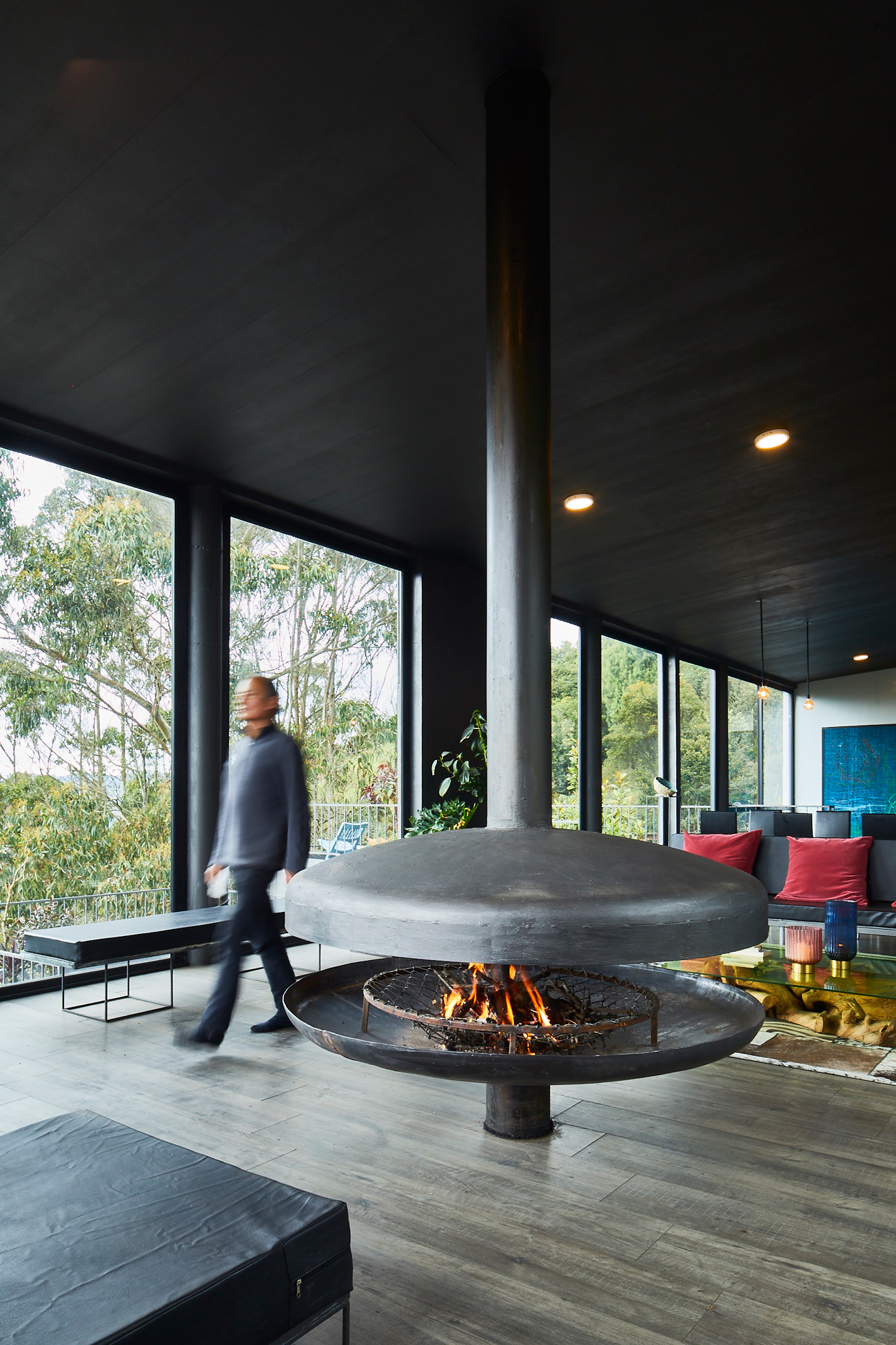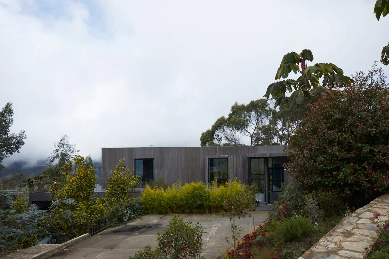 Su fachada, oscura y texturizada, construida a partir de listones de fibrocemento pintados con grafito y tintilla, se asemeja a la madera quemada de los japoneses y se mimetiza con la naturaleza circundante, con los bosques, los eucaliptos, los yarumos, los amarrabollos, los magnolios, las montañas, las rocas y la tierra que la rodean. Aparece y desaparece en el paisaje, y no hay forma de verla en su totalidad de un solo golpe. La entrada gira en torno a una chimenea de gas. “Alguna vez, en la casa de un amigo, entré y sentí más frío adentro que afuera.